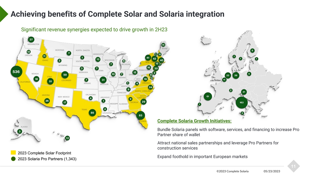Complete Solaria manages the entire value chain Bringing a unique model to the residential solar market Upstream Value Chain Downstream Value Chain Manufacturing Phase Deployment Phase Workflow Project Product Design Manufacturing Distribution Sales Installation Financing Automation &/or Sample Companies Development Specialty Software Complete Solaria Model Traditional Manufacturers Vertically Integrated Downstream Traditional Various National, Regional and Local Regional, Local Sales and Installers Installers Financing Platforms Software Platforms Legend: Internal capability Capability accessed by coordinating third parties Both internal capability and capability accessed by coordinating third parties Capability not offered 10 ©2023 Complete Solaria 05/23/2023