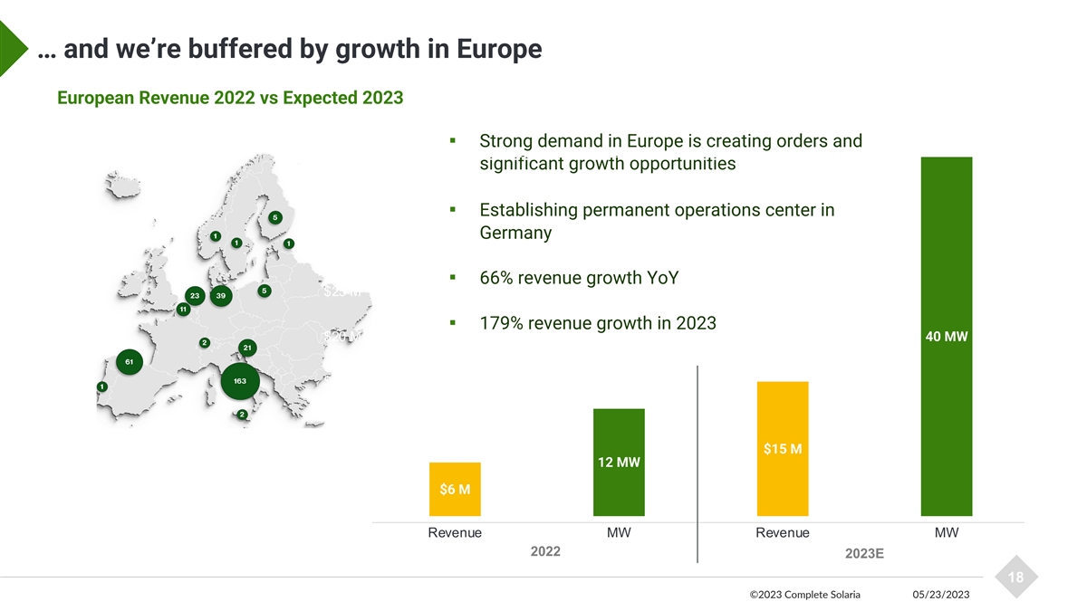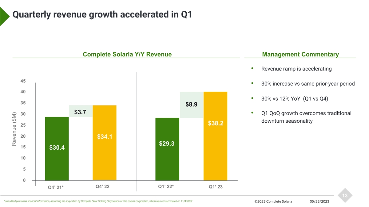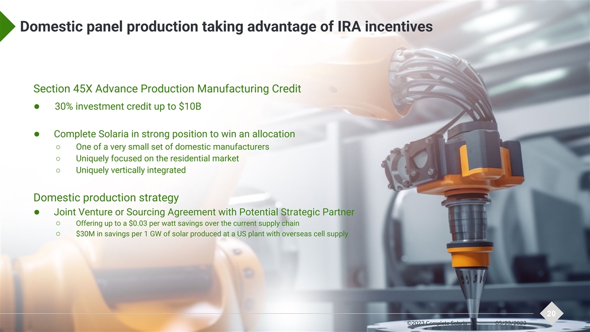 Complete Solaria 2023 Forecast Outlook Revenue • Sales up 90% vs. FY22 • Systems growth fueled by new markets • Modules reflect current market Gross Margin • Q2 return to historic averages in Systems business • Growth in margins driven by cost reductions and scale benefits Net Income • Subsidiary debt refinancing • Break-even in Q4 24 ©2023 Complete Solaria 05/23/2023