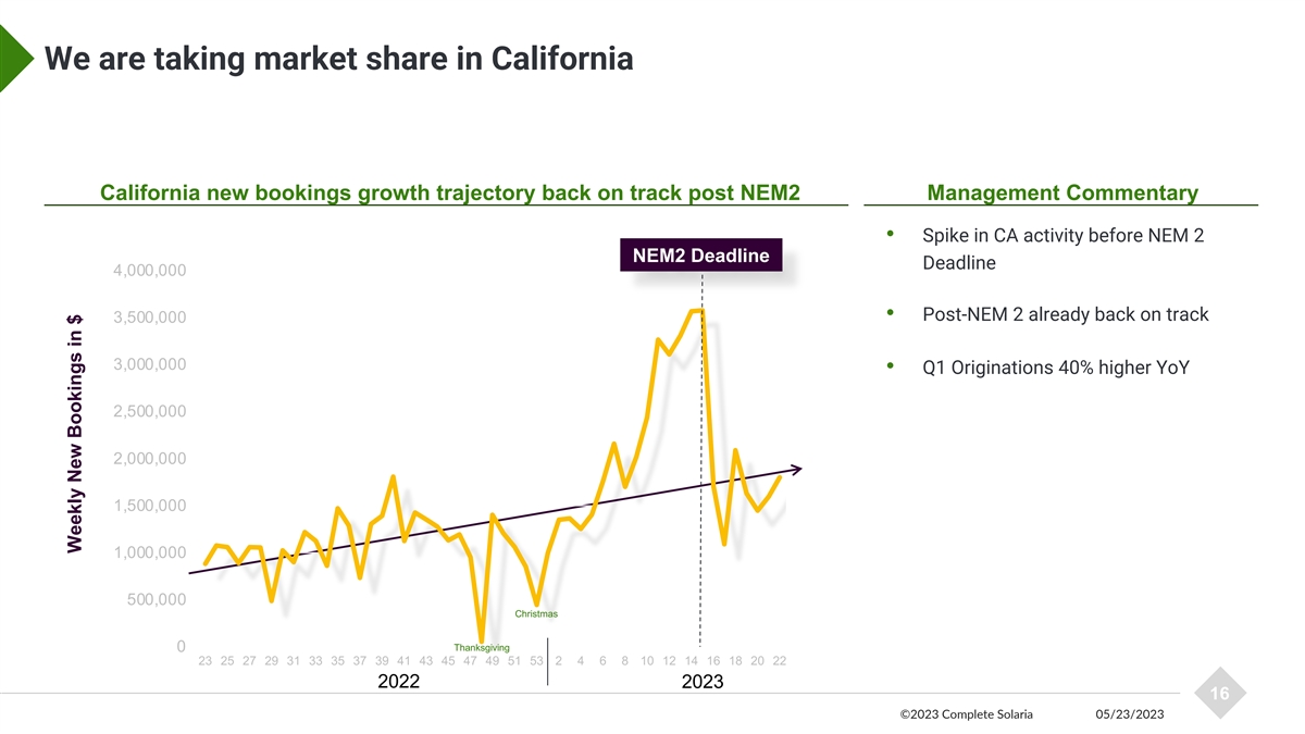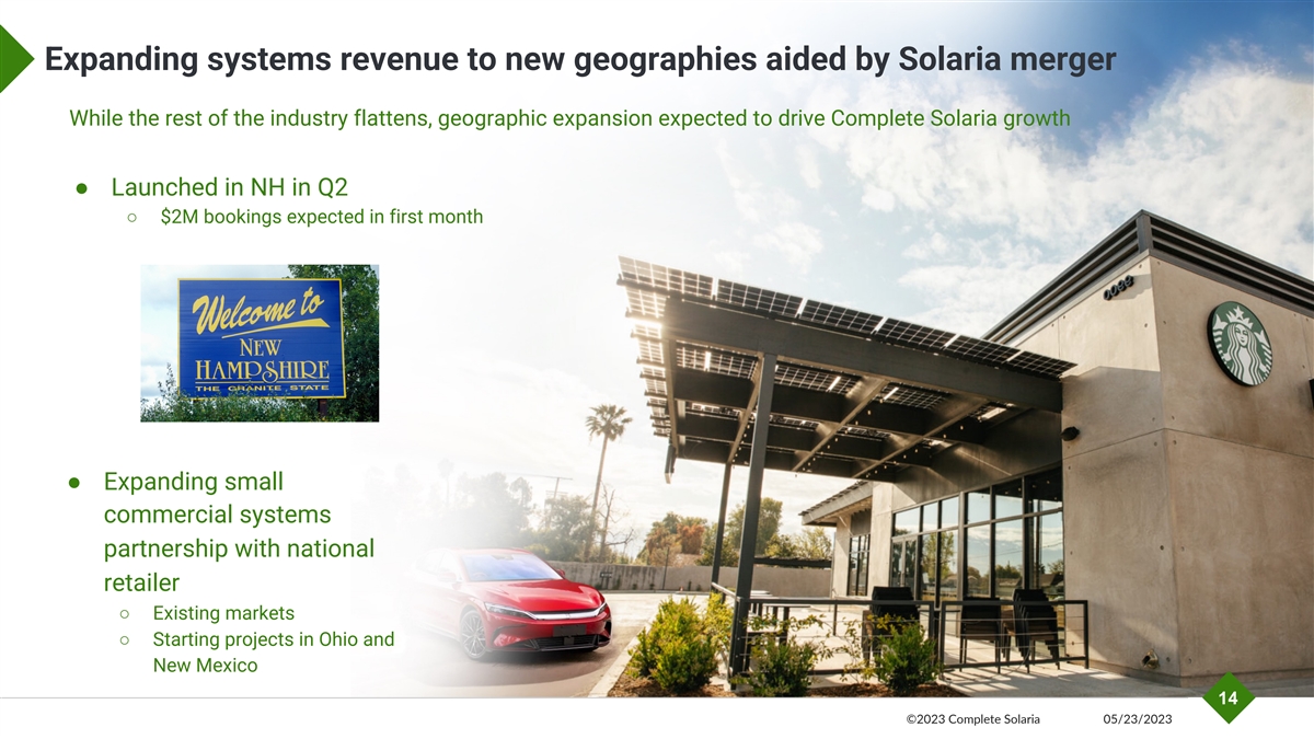 Expanding systems revenue to new geographies aided by Solaria merger While the rest of the industry flattens, geographic expansion expected to drive Complete Solaria growth ● Launched in NH in Q2 ○ $2M bookings expected in first month ● Expanding small commercial systems partnership with national retailer ○ Existing markets ○ Starting projects in Ohio and New Mexico 14 ©2023 Complete Solaria 05/23/2023