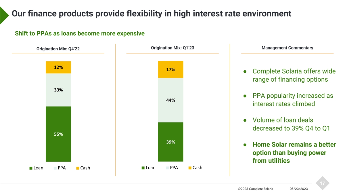 We are taking market share in California California new bookings growth trajectory back on track post NEM2 Management Commentary • Spike in CA activity before NEM 2 Series 1 NEM2 Deadline Deadline 4,000,000 • Post-NEM 2 already back on track 3,500,000 3,000,000 • Q1 Originations 40% higher YoY 2,500,000 2,000,000 1,500,000 1,000,000 500,000 Christmas Thanksgiving 0 23 25 27 29 31 33 35 37 39 41 43 45 47 49 51 53 2 4 6 8 10 12 14 16 18 20 22 2022 2023 16 ©2023 Complete Solaria 05/23/2023 Weekly New Bookings in $