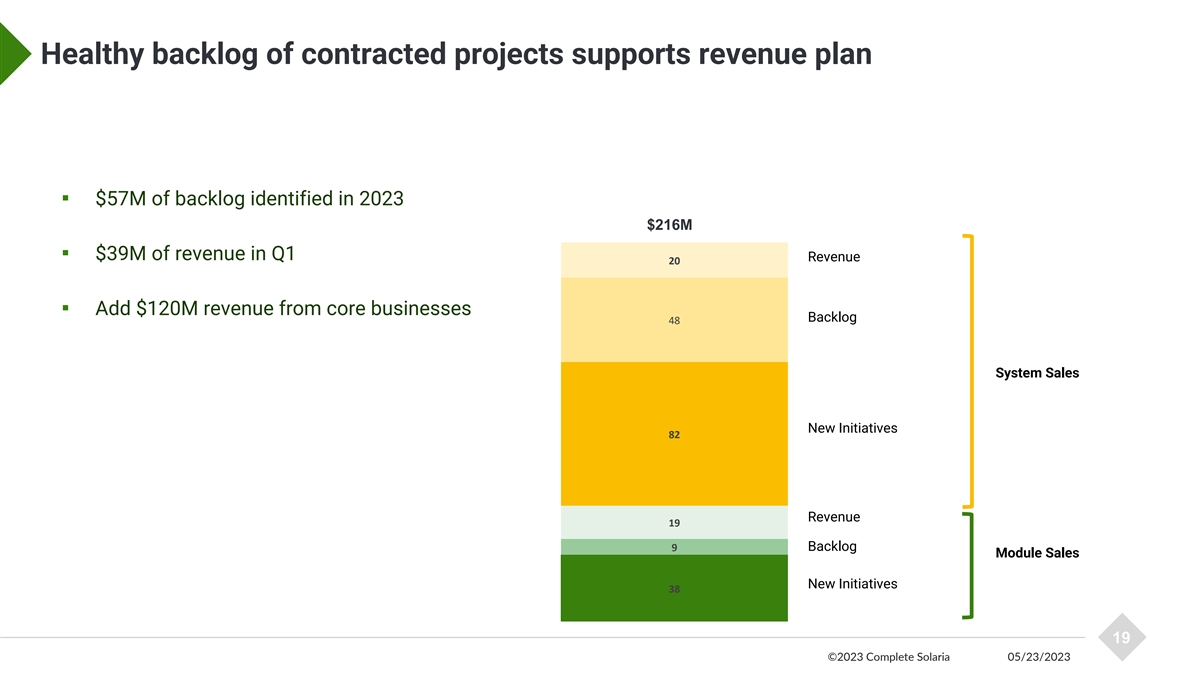Healthy backlog of contracted projects supports revenue plan ▪ $57M of backlog identified in 2023 $216M ▪ $39M of revenue in Q1 Revenue 20 ▪ Add $120M revenue from core businesses Backlog 48 System Sales New Initiatives 82 Revenue 19 9 Backlog Module Sales New Initiatives 38 19 ©2023 Complete Solaria 05/23/2023