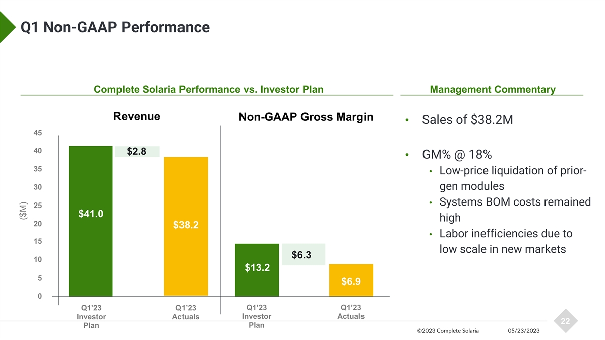 Q1 Non-GAAP Performance Complete Solaria Performance vs. Investor Plan Management Commentary Revenue Non-GAAP Gross Margin • Sales of $38.2M 45 40 $2.8 • GM% @ 18% 35 • Low-price liquidation of prior- 30 gen modules • Systems BOM costs remained 25 $41.0 high 20 $38.2 • Labor inefficiencies due to 15 low scale in new markets $6.3 10 $13.2 5 $6.9 0 Q1’23 Q1’23 Q1’23 Q1’23 Investor Actuals Investor Actuals 22 Plan Plan ©2023 Complete Solaria 05/23/2023 ($M)