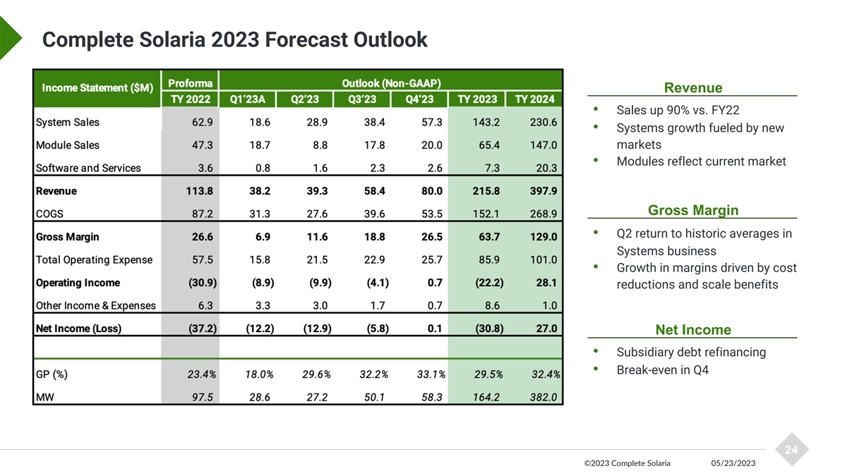 Forecasted Path to Profitability Q1 to Q4 2023 Non-GAAP Net Income Bridge $0M $3M $3M $4M ($2M) $5M ($12M) Q1'23 Volume Systems Costs Module Costs Opex Interest Expense Q4'23 Projected FY23 Improvements • Sales of $80.0M in Q4, up 100% vs. Q1 • Systems BOM cost reductions from lower module & components costs • Greater Modules margins driven by next gen PowerX+ and Power XT products • Opex investment to support sales growth • Refinance subsidiary debt post-deSPAC 23 See reconciliation of non-GAAP to GAAP financial measures on slide 31 ©2023 Complete Solaria 05/23/2023