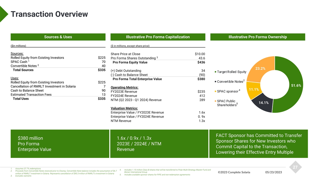 Public Comparables Valuation at Announcement vs. Today Since announcement, peer share prices have decreased ~26% on average 1 Complete Solaria has lowered its pre-money equity value from $450mm to $225mm Downstream Companies Upstream Companies Change in share price since (59.0%) (34.7%) (49.0%) (43.7%) (36.9%) 27.8% 16.4% announcement: 13.7x 11.3x 9.7x 7.7x 6.8x EV/23E Revenue: 5.5x 4.2x 3.4x 2.8x 2.3x 2.1x 1.2x 1.0x 0.7x At Announcement Current Valuation 26 Source: FactSet Note: Market data as of 5/22/2023, At announcement data as of 9/28/2022 ©2023 Complete Solaria 05/23/2023 1. In light of this updated valuation, Freedom and Complete Solaria intend to correspondingly amend the valuation reflected in their business combination agreement