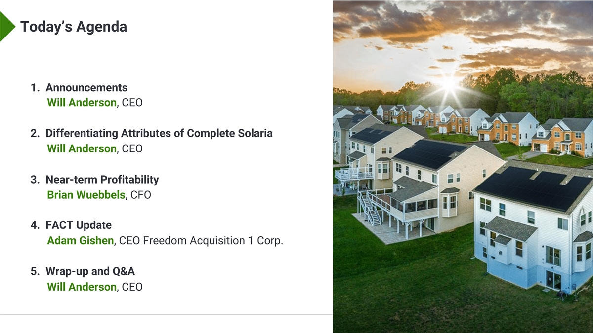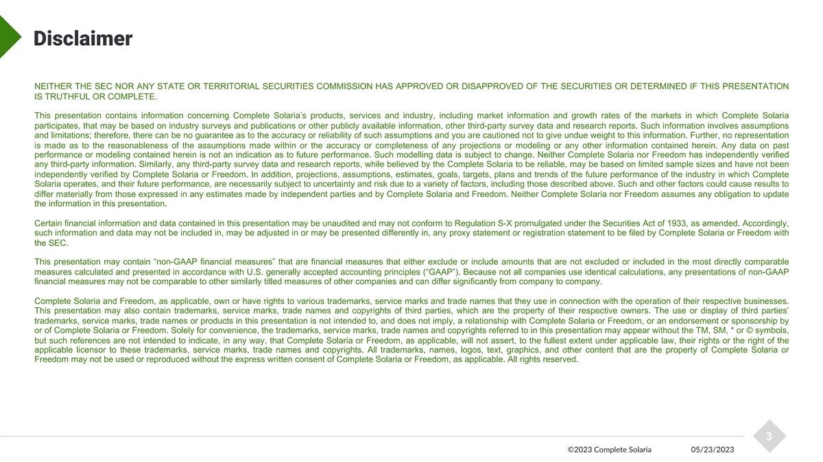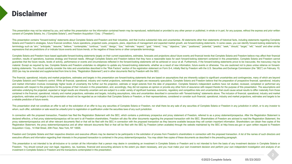 Disclaimer This presentation may not be retained by you, and neither this presentation nor the information contained herein may be reproduced, redistributed or provided to any other person or published, in whole or in part, for any purpose, without the express and prior written consent of Complete Solaria, Inc. (“Complete Solaria”), and Freedom Acquisition I Corp. (“Freedom”). This presentation contains “forward-looking” statements about Complete Solaria and Freedom and their industries, and that involve substantial risks and uncertainties. All statements other than statements of historical facts, including statements regarding Complete Solaria and Freedom’s strategies, future financial condition, future operations, projected costs, prospects, plans, objectives of management and expected market growth, are forward-looking statements. In some cases, you can identify forward-looking statements by terminology such as “aim,” “anticipate,” “assume,” “believe,” “contemplate,” “continue,” “could,” “design,” “due,” “estimate,” “expect,” “goal,” “intend,” “may,” “objective,” “plan,” “positioned,” “potential,” “predict,” “seek,” “should,” “target,” “will,” “would” and other similar expressions that are predictions of or indicate future events and future trends, or the negative of these terms or other comparable terminology. Complete Solaria and Freedom have based applicable forward-looking statements largely on their current expectations, estimates, forecasts and projections about future events and financial trends that Complete Solaria and Freedom believe may affect their financial condition, results of operations, business strategy and financial needs. Although Complete Solaria and Freedom believe that they have a reasonable basis for each forward-looking statement contained in this presentation, Complete Solaria and Freedom cannot guarantee that the future results, levels of activity, performance or events and circumstances reflected in the forward-looking statements will be achieved or occur at all. Furthermore, if the forward-looking statements prove to be inaccurate, the inaccuracy may be material. Except as required by law, Complete Solaria and Freedom undertake no obligation to update any forward-looking statements, whether as a result of new information, future events or otherwise. You are cautioned not to place undue reliance on forward- looking statements. You should carefully consider the risks and uncertainties described in the “Risk Factors” section of the registration statement on Form S-4, initially filed by Freedom with the U.S. Securities and Exchange Commission (the “SEC”) on February 10, 2023 (as may be amended and supplemented from time to time, “Registration Statement”) and in other documents filed by Freedom with the SEC. The financial, operational, industry and market projections, estimates and targets in this presentation are forward-looking statements that are based on assumptions that are inherently subject to significant uncertainties and contingencies, many of which are beyond Complete Solaria's and Freedom's control. While all financial, operational, industry and market projections, estimates and targets are necessarily speculative, Complete Solaria and Freedom believe that the preparation of prospective financial, operational, industry and market information involves increasingly higher levels of uncertainty the further out the projection, estimate or target extends from the date of preparation. Complete Solaria's independent auditors have not studied, reviewed, completed or performed any procedures with respect to the projections for the purpose of their inclusion in this presentation, and, accordingly, they did not express an opinion or provide any other form of assurance with respect thereto for the purpose of this presentation. The assumptions and estimates underlying the projected, expected or target results are inherently uncertain and are subject to a wider variety of significant business, economic, regulatory and competitive risks and uncertainties that could cause actual results to differ materially from those contained in the financial, operational, industry and market projections, estimates and targets, including assumptions, risks and uncertainties described in connection with “forward-looking” statements above. The inclusion of financial, operational, industry and market projections, estimates and targets in this presentation should not be regarded as an indication that Complete Solaria or Freedom, or their representatives, considered or consider such financial, operational, industry and market projections, estimates and targets to be a reliable prediction of future events. This presentation shall not constitute an offer to sell or the solicitation of an offer to buy any securities of Complete Solaria or Freedom, nor shall there be any sale of any securities of Complete Solaria or Freedom in any jurisdiction in which, or to any investor to whom, such offer, solicitation or sale would be unlawful prior to registration or qualification under the securities laws of any such jurisdiction. In connection with the proposed transaction, Freedom has filed the Registration Statement with the SEC, which contains a preliminary prospectus and proxy statement of Freedom, referred to as a proxy statement/prospectus. After the Registration Statement is declared effective, a final proxy statement/prospectus will be sent to all Freedom shareholders. Freedom will also file other documents regarding the proposed transaction with the SEC. Shareholders of Freedom are advised to read the Registration Statement, the proxy statement/prospectus and all other relevant documents filed or that will be filed with the SEC in connection with the proposed transaction as they become available because they will contain important information. Shareholders can obtain
