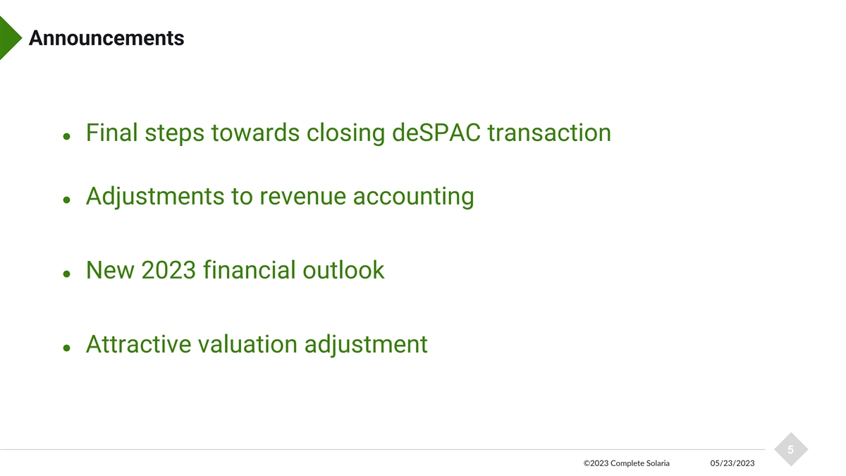 Today’s Agenda 1. Announcements Will Anderson, CEO 2. Differentiating Attributes of Complete Solaria Will Anderson, CEO 3. Near-term Profitability Brian Wuebbels, CFO 4. FACT Update Adam Gishen, CEO Freedom Acquisition 1 Corp. 5. Wrap-up and Q&A Will Anderson, CEO 4 ©2023 Complete Solaria 05/23/2023