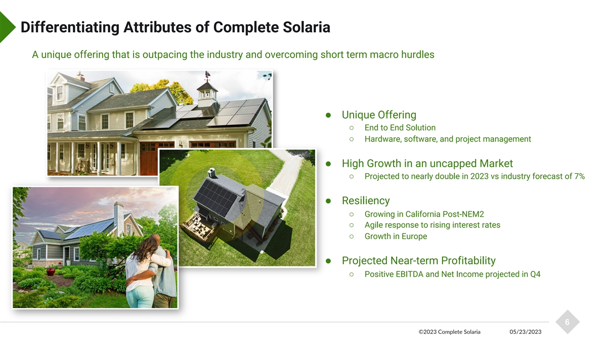 Announcements ● Final steps towards closing deSPAC transaction ● Adjustments to revenue accounting ● New 2023 financial outlook ● Attractive valuation adjustment 5 ©2023 Complete Solaria 05/23/2023