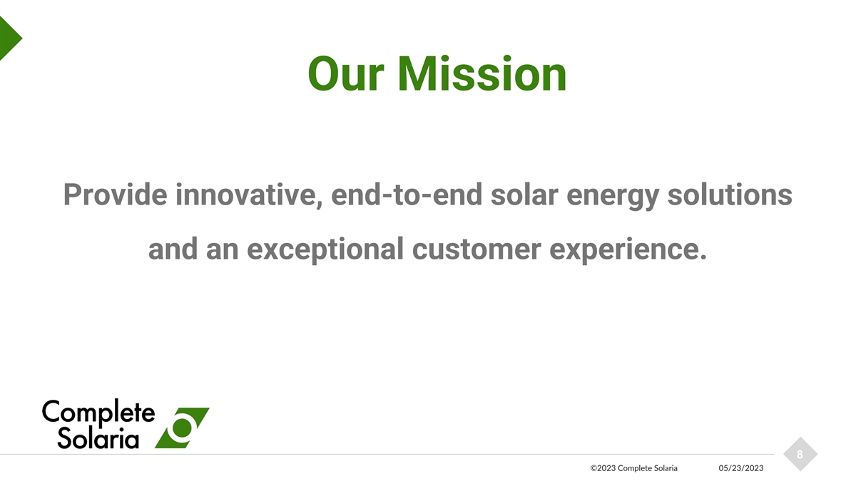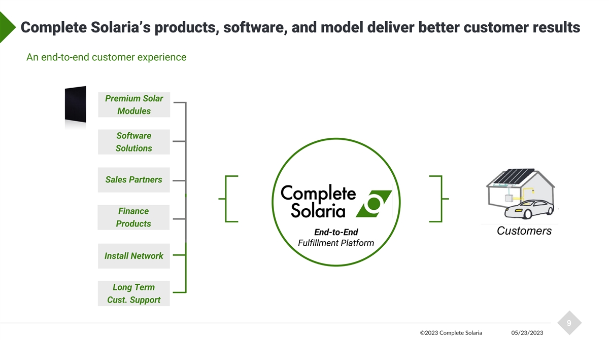Our Mission Provide innovative, end-to-end solar energy solutions and an exceptional customer experience. 8 ©2023 Complete Solaria 05/23/2023