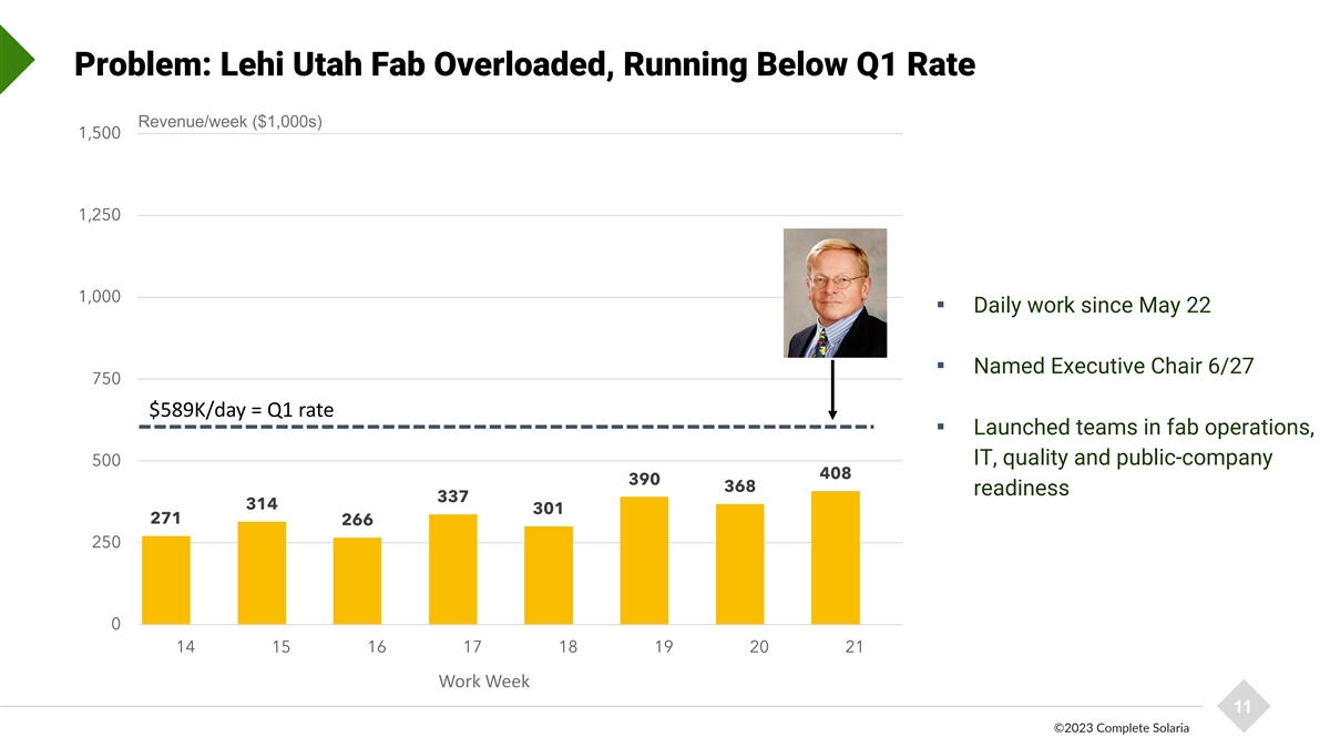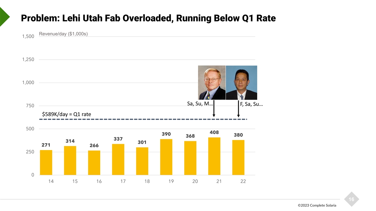 Problem: Lehi Utah Fab Overloaded, Running Below Q1 Rate Revenue/day ($1,000s) 1,500 1,250 1,000 Sa, Su, M… F, Sa, Su… 750 $589K/day = Q1 rate 500 408 390 380 368 337 314 301 271 266 250 0 14 15 16 17 18 19 20 21 22 Actual 16 ©2023 Complete Solaria ($000)