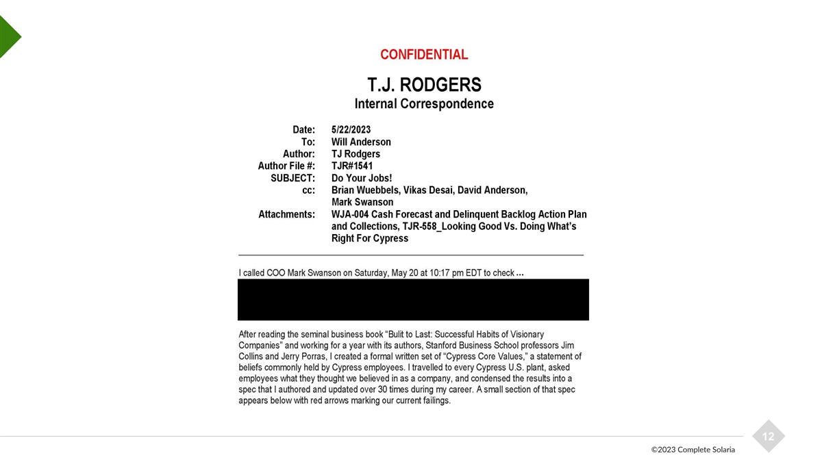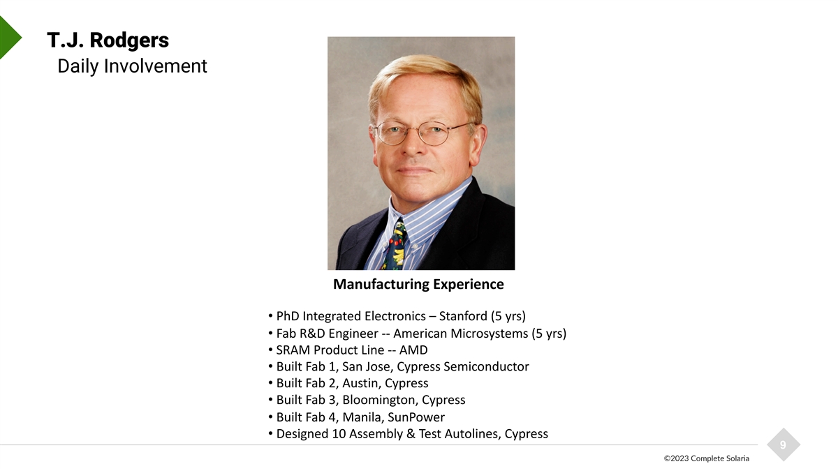 T.J. Rodgers Daily Involvement Manufacturing Experience • PhD Integrated Electronics – Stanford (5 yrs) • Fab R&D Engineer -- American Microsystems (5 yrs) • SRAM Product Line -- AMD • Built Fab 1, San Jose, Cypress Semiconductor • Built Fab 2, Austin, Cypress • Built Fab 3, Bloomington, Cypress • Built Fab 4, Manila, SunPower • Designed 10 Assembly & Test Autolines, Cypress 9 ©2023 Complete Solaria