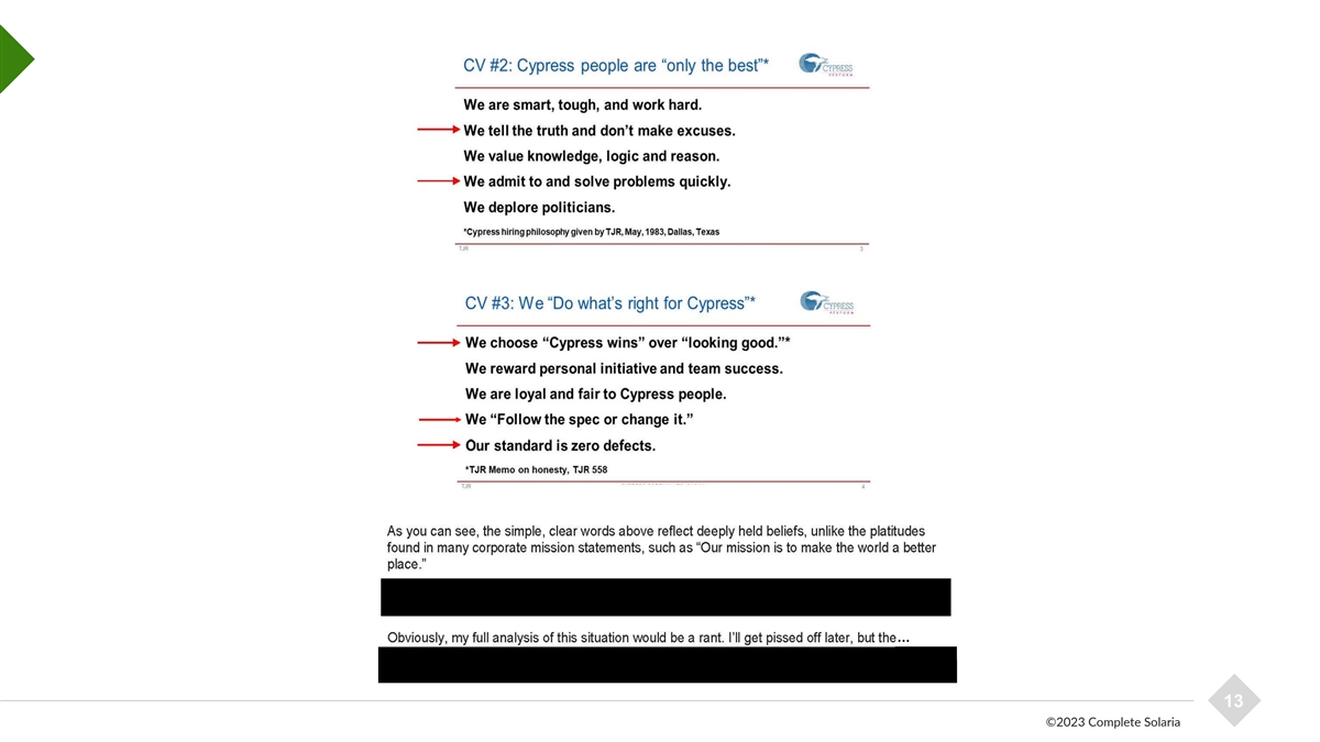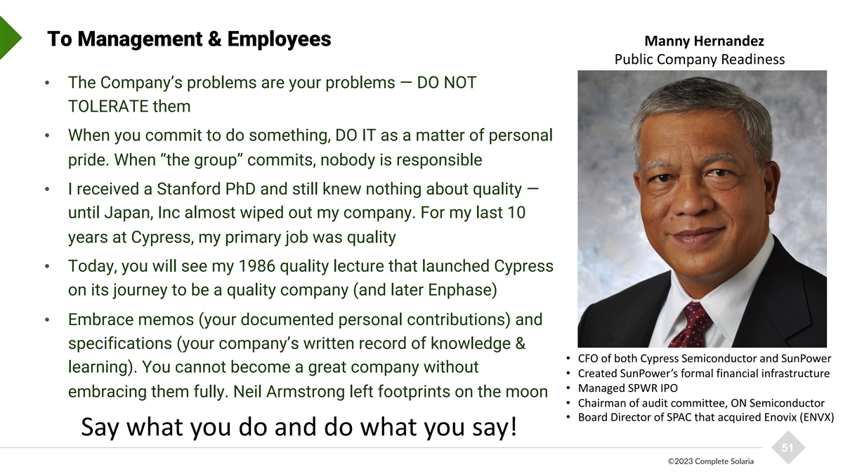 Manny Hernandez To Management & Employees Public Company Readiness • The Company’s problems are your problems — DO NOT TOLERATE them • When you commit to do something, DO IT as a matter of personal pride. When “the group” commits, nobody is responsible • I received a Stanford PhD and still knew nothing about quality — until Japan, Inc almost wiped out my company. For my last 10 years at Cypress, my primary job was quality • Today, you will see my 1986 quality lecture that launched Cypress on its journey to be a quality company (and later Enphase) • Embrace memos (your documented personal contributions) and specifications (your company’s written record of knowledge & • CFO of both Cypress Semiconductor and SunPower learning). You cannot become a great company without • Created SunPower’s formal financial infrastructure • Managed SPWR IPO embracing them fully. Neil Armstrong left footprints on the moon • Chairman of audit committee, ON Semiconductor • Board Director of SPAC that acquired Enovix (ENVX) Say what you do and do what you say! 51 ©2023 Complete Solaria