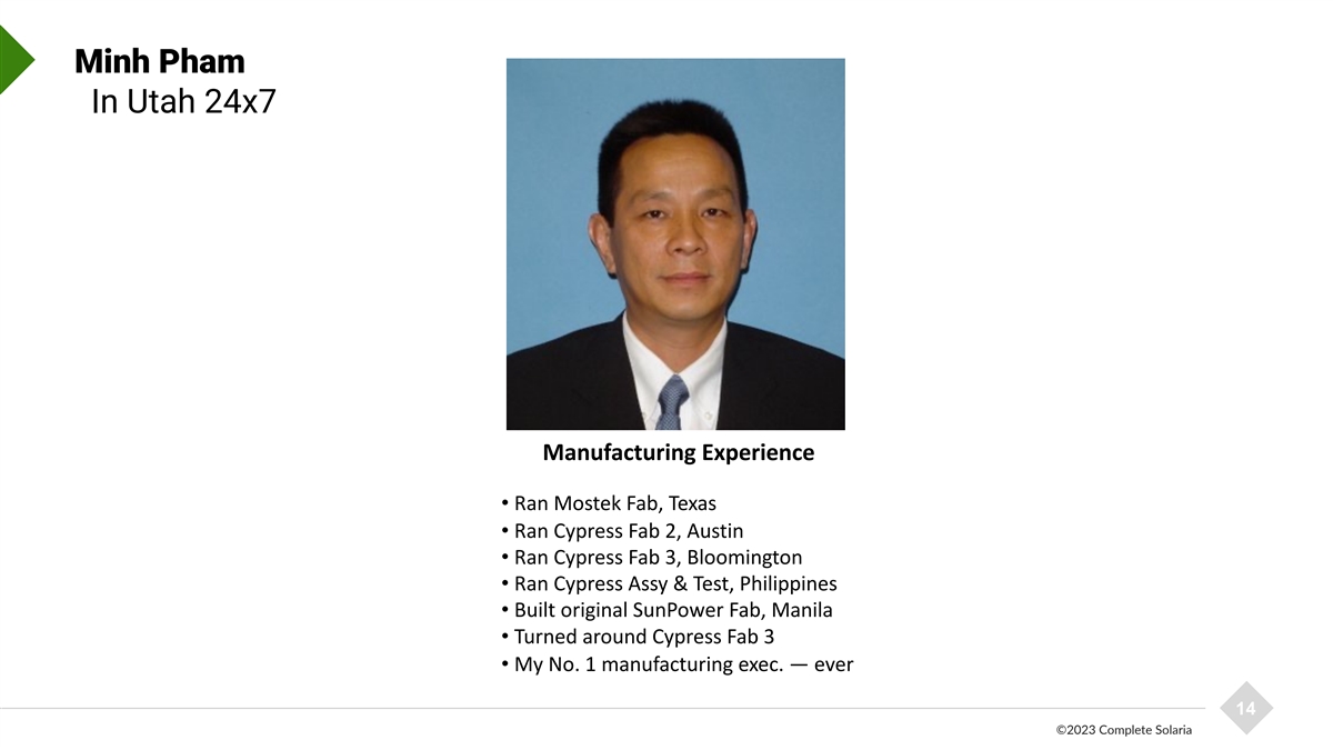Minh Pham In Utah 24x7 Manufacturing Experience • Ran Mostek Fab, Texas • Ran Cypress Fab 2, Austin • Ran Cypress Fab 3, Bloomington • Ran Cypress Assy & Test, Philippines • Built original SunPower Fab, Manila • Turned around Cypress Fab 3 • My No. 1 manufacturing exec. — ever 14 ©2023 Complete Solaria