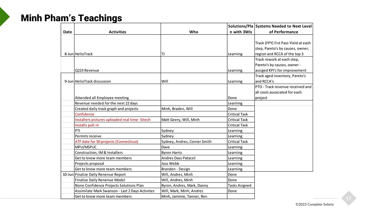 Minh Pham’s Teachings Solutions/Pla Systems Needed to Next Level Date Activities Who n with 3WIs of Performance Track (FPY) Fist Pass Yield at each step, Pareto's by causes, owner, 8-Jun HelioTrack TJ Learning region and RCCA of the top 3 Track rework at each step, Pareto's by causes, owner - Q223 Revenue Learning assiged KPI's for improvement Track aged inventory, Pareto's 9-Jun HelioTrack discussion Will Learning and RCCA's PTO - Track revenue received and all costs associated for each Attended all Employee meeting Done project Revenue needed for the next 22 days Learning Created daily track graph and projects Minh, Braden, Will Done Confidence Critical Task Installers pictures uploaded real time- Sitech Matt Geery, Will, Minh Critical Task Installs pull-in Critical Task PTI Sydney Learning Permits receive Sydney Learning ATF date for 50 projects (Connecticut) Sydney, Andres, Corner Smith Critical Task MPU/MSPUC Dave Learning Construction, IM & Installers Byron Harris Learning Get to know more team members Andres Dass Patacsil Learning Projects proposal Joss Webb Learning Get to know more team members Branden - Design Learning 10-Jun Finalize Daily Renenue Report Will, Andres, Minh Done Finalize Daily Renenue Model Will, Andres, Minh Done None Confidence Projects Solutions Plan Byron, Andres, Mark, Danny Tasks Asigned Assimilate Mark Swanson - Last 2 Days Activites Will, Mark, Minh, Andres Done Get to know more team members Minh, Jammie, Tanner, Ben 17 ©2023 Complete Solaria