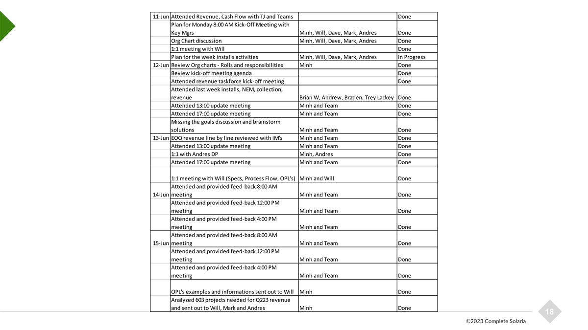 11-Jun Attended Revenue, Cash Flow with TJ and Teams Done Plan for Monday 8:00 AM Kick-Off Meeting with Key Mgrs Minh, Will, Dave, Mark, Andres Done Org Chart discussion Minh, Will, Dave, Mark, Andres Done 1:1 meeting with Will Done Plan for the week installs activities Minh, Will, Dave, Mark, Andres In Progress 12-Jun Review Org charts - Rolls and responsibilities Minh Done Review kick-off meeting agenda Done Attended revenue taskforce kick-off meeting Done Attended last week installs, NEM, collection, revenue Brian W, Andrew, Braden, Trey Lackey Done Attended 13:00 update meeting Minh and Team Done Attended 17:00 update meeting Minh and Team Done Missing the goals discussion and brainstorm solutions Minh and Team Done 13-Jun EOQ revenue line by line reviewed with IM's Minh and Team Done Attended 13:00 update meeting Minh and Team Done 1:1 with Andres DP Minh, Andres Done Attended 17:00 update meeting Minh and Team Done 1:1 meeting with Will (Specs, Process Flow, OPL's) Minh and Will Done Attended and provided feed-back 8:00 AM 14-Jun meeting Minh and Team Done Attended and provided feed-back 12:00 PM meeting Minh and Team Done Attended and provided feed-back 4:00 PM meeting Minh and Team Done Attended and provided feed-back 8:00 AM 15-Jun meeting Minh and Team Done Attended and provided feed-back 12:00 PM meeting Minh and Team Done Attended and provided feed-back 4:00 PM meeting Minh and Team Done OPL's examples and informations sent out to Will Minh Done Analyzed 603 projects needed for Q223 revenue and sent out to Will, Mark and Andres Minh Done 18 ©2023 Complete Solaria
