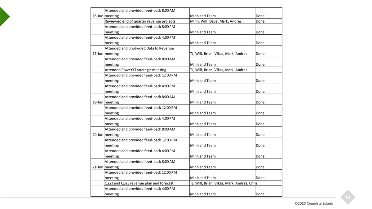 Attended and provided feed-back 8:00 AM 16-Jun meeting Minh and Team Done Reviewed end of quarter revenue projects Minh, Will, Dave, Mark, Andres Done Attended and provided feed-back 8:00 PM meeting Minh and Team Done Attended and provided feed-back 4:00 PM meeting Minh and Team Done Attended and prodvided Data to Revenue 17-Jun meeting TJ, Will, Brian, Vikas, Mark, Andres Done Attended and provided feed-back 8:00 AM meeting Minh and Team Done Attended PowerXT strategic meeting TJ, Will, Brian, Vikas, Mark, Andres Attended and provided feed-back 12:00 PM meeting Minh and Team Done Attended and provided feed-back 4:00 PM meeting Minh and Team Done Attended and provided feed-back 8:00 AM 19-Jun meeting Minh and Team Done Attended and provided feed-back 12:00 PM meeting Minh and Team Done Attended and provided feed-back 4:00 PM meeting Minh and Team Done Attended and provided feed-back 8:00 AM 20-Jun meeting Minh and Team Done Attended and provided feed-back 12:00 PM meeting Minh and Team Done Attended and provided feed-back 4:00 PM meeting Minh and Team Done Attended and provided feed-back 8:00 AM 21-Jun meeting Minh and Team Done Attended and provided feed-back 12:00 PM meeting Minh and Team Done Q223 and Q323 revenue plan and forecast TJ, Will, Brian, Vikas, Mark, Andres, Chris Attended and provided feed-back 4:00 PM meeting Minh and Team Done 19 ©2023 Complete Solaria