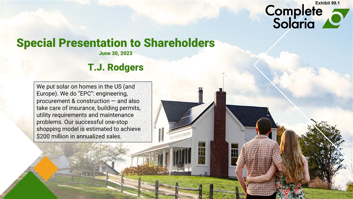 Exhibit 99.1 Special Presentation to Shareholders June 30, 2023 T.J. Rodgers We put solar on homes in the US (and Europe). We do “EPC”: engineering, procurement & construction — and also take care of insurance, building permits, utility requirements and maintenance problems. Our successful one-stop shopping model is estimated to achieve $200 million in annualized sales.