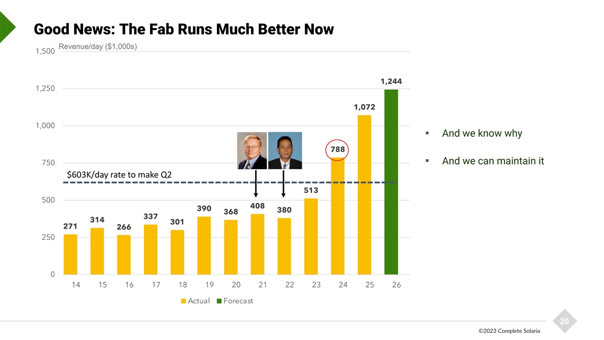 Good News: The Fab Runs Much Better Now Revenue/day ($1,000s) 1,500 1,244 1,250 1,072 1,000 ▪ And we know why 788 ▪ And we can maintain it 750 $603K/day rate to make Q2 513 500 408 390 380 368 337 314 301 271 266 250 0 14 15 16 17 18 19 20 21 22 23 24 25 26 Actual Forecast 20 ©2023 Complete Solaria ($000)
