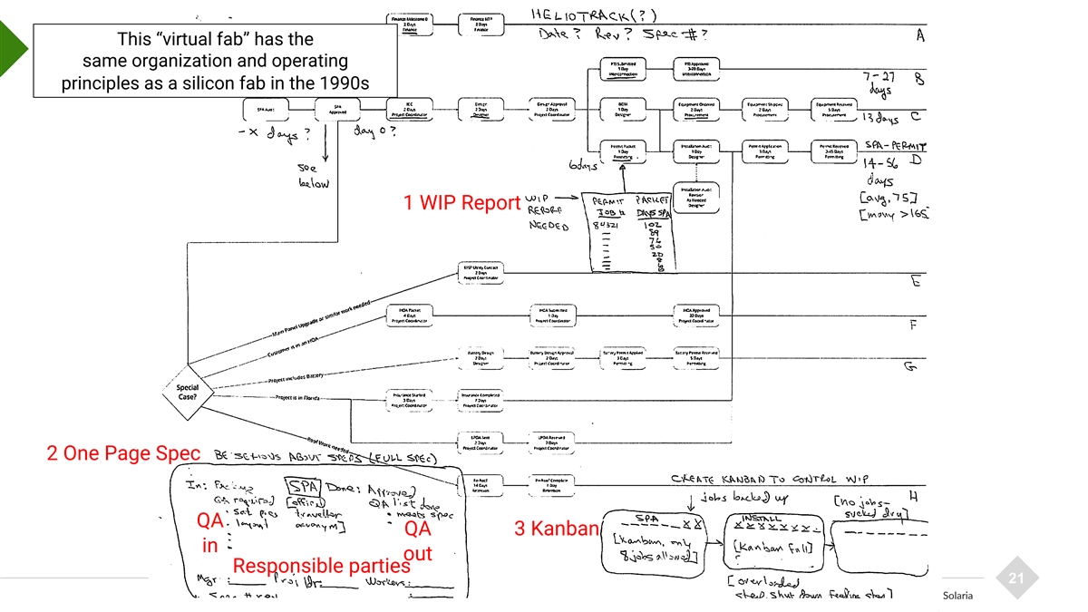 This “virtual fab” has the Complete Solaria Fab Flow same organization and operating prT. inci Jpl . e R so ad s g a e sirls icon ’s A fan b a inl y th s ei s 1990s 1 WIP Report 2 One Page Spec QA QA 3 Kanban in out Responsible parties 21 ©2023 Complete Solaria