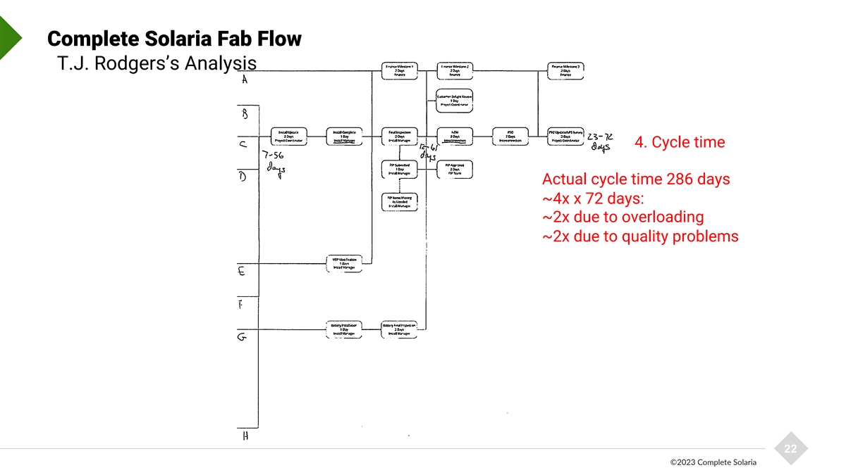 Complete Solaria Fab Flow T.J. Rodgers’s Analysis 4. Cycle time Actual cycle time 286 days ~4x x 72 days: ~2x due to overloading ~2x due to quality problems 22 ©2023 Complete Solaria