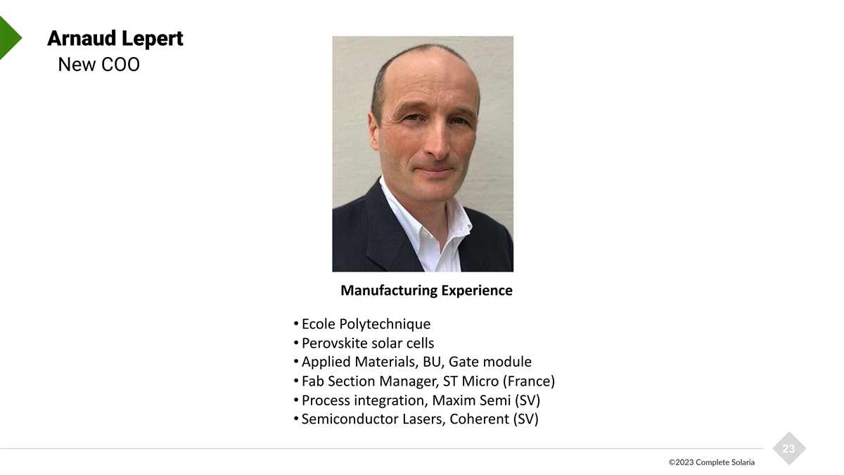 Arnaud Lepert New COO Manufacturing Experience • Ecole Polytechnique • Perovskite solar cells • Applied Materials, BU, Gate module • Fab Section Manager, ST Micro (France) • Process integration, Maxim Semi (SV) • Semiconductor Lasers, Coherent (SV) 23 ©2023 Complete Solaria
