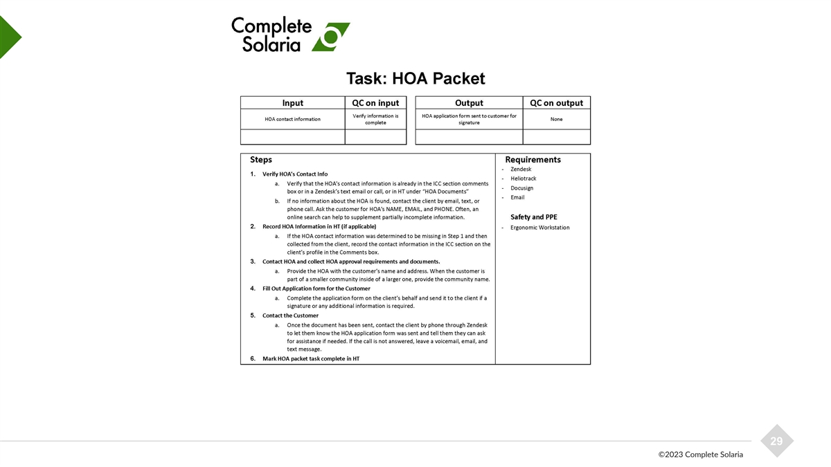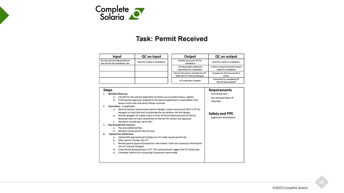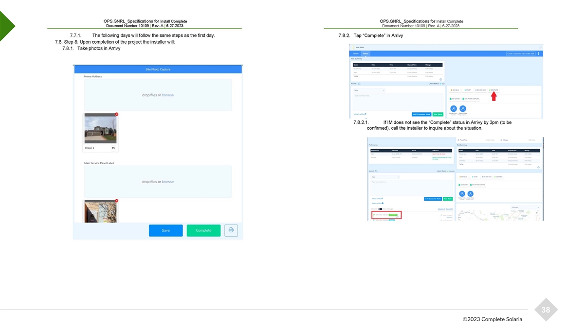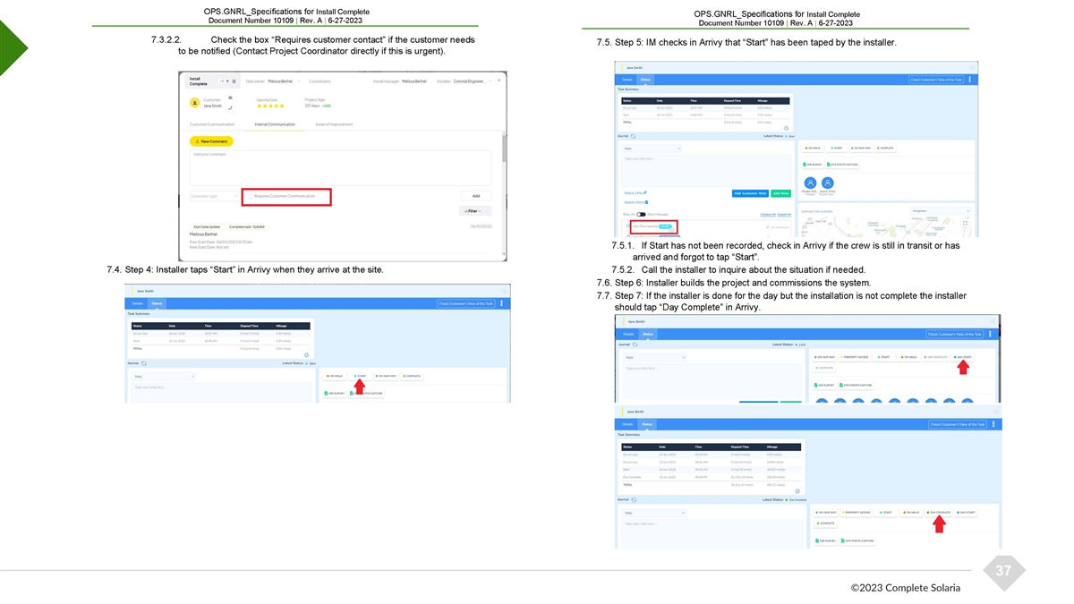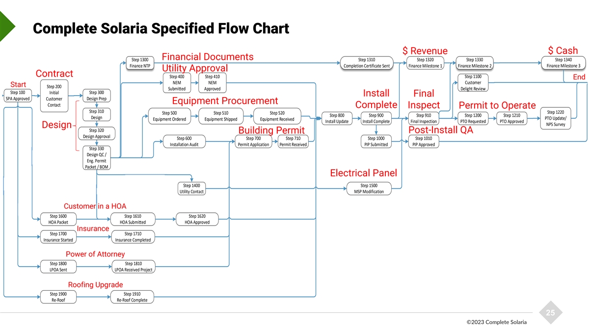 Complete Solaria Specified Flow Chart $ Cash $ Revenue Financial Documents Step 1300 Step 1310 Step 1320 Step 1330 Step 1340 Finance NTP Completion Certificate Sent Finance Milestone 1 Finance Milestone 2 Finance Milestone 3 Utility Approval Contract Step 1100 Step 400 Step 410 End Customer END NEM NEM Start Step 200 Delight Review Submitted Approved Start Step 100 Initial Step 300 Install Final (SPA Audit) SPA Approved Customer Design Prep Equipment Procurement Contact Complete Inspect Permit to Operate Step 310 Step 1220 Step 500 Step 510 Step 520 Step 800 Step 900 Step 910 Step 1200 Step 1210 Design PTO Update/ Equipment Ordered Equipment Shipped Equipment Received Install Update Install Complete Final Inspection PTO Requested PTO Approved NPS Survey Design Step 320 Post-Install QA Building Permit Design Approval Step 600 Step 700 Step 710 Step 1000 Step 1010 Installation Audit Permit Application Permit Received PIP Submitted PIP Approved Step 330 Design QC / Customer in Eng. Permit a HOA Packet / BOM Electrical Modifications Electrical Panel Necessary Roof Work Step 1400 Step 1500 Needed Customer in a HOA Utility Contact MSP Modification Project in Customer in a HOA Florida Step 1600 Step 1610 Step 1620 HOA Packet HOA Submitted HOA Approved Insurance Step 1700 Step 1710 Insurance Started Insurance Completed Power of Attorney Step 1800 Step 1810 LPOA Sent LPOA Received Project Roofing Upgrade Step 1900 Step 1910 Re-Roof Re-Roof Complete 25 ©2023 Complete Solaria