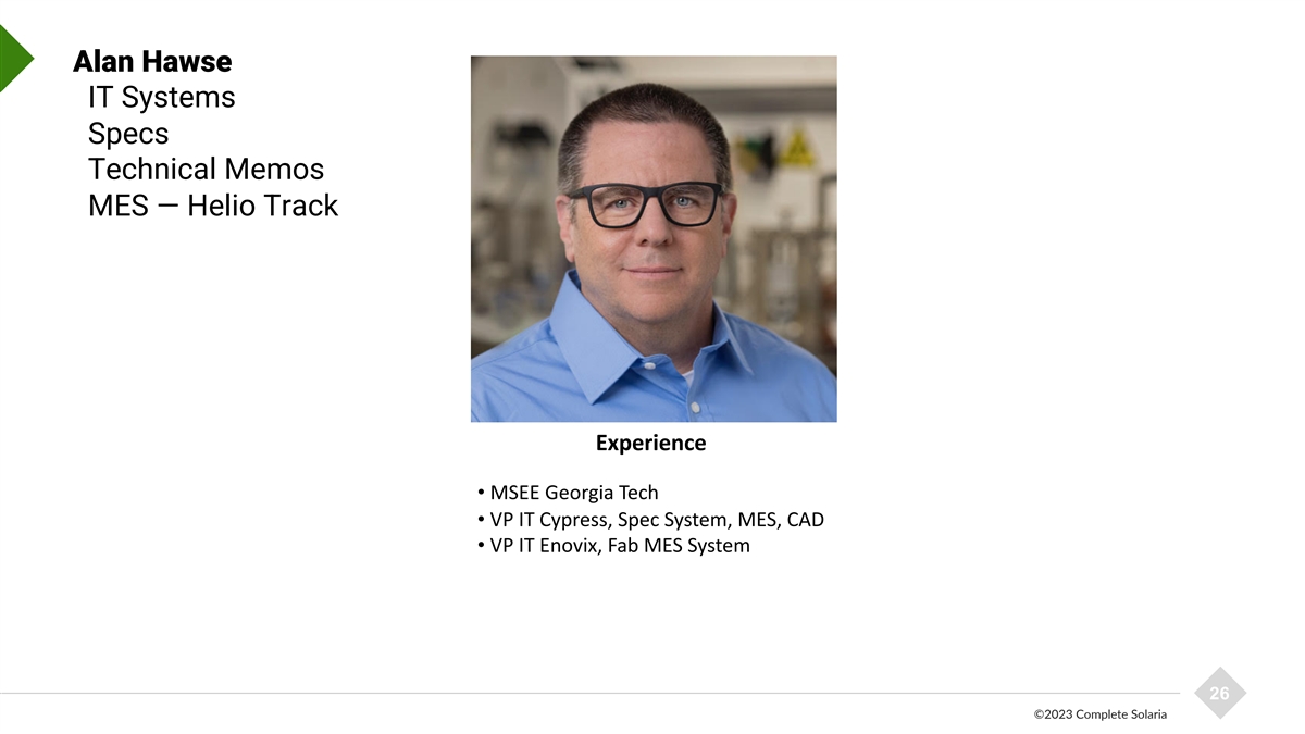 Alan Hawse IT Systems Specs Technical Memos MES — Helio Track Experience • MSEE Georgia Tech • VP IT Cypress, Spec System, MES, CAD • VP IT Enovix, Fab MES System 26 ©2023 Complete Solaria