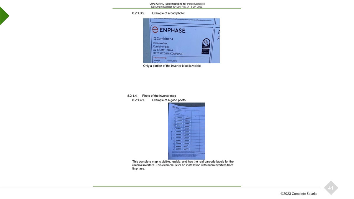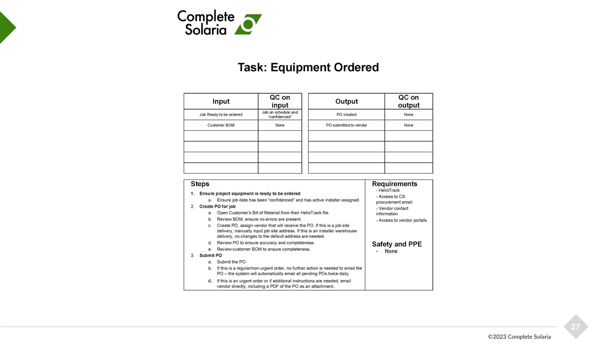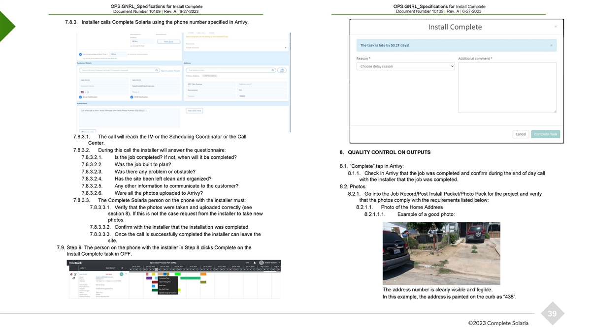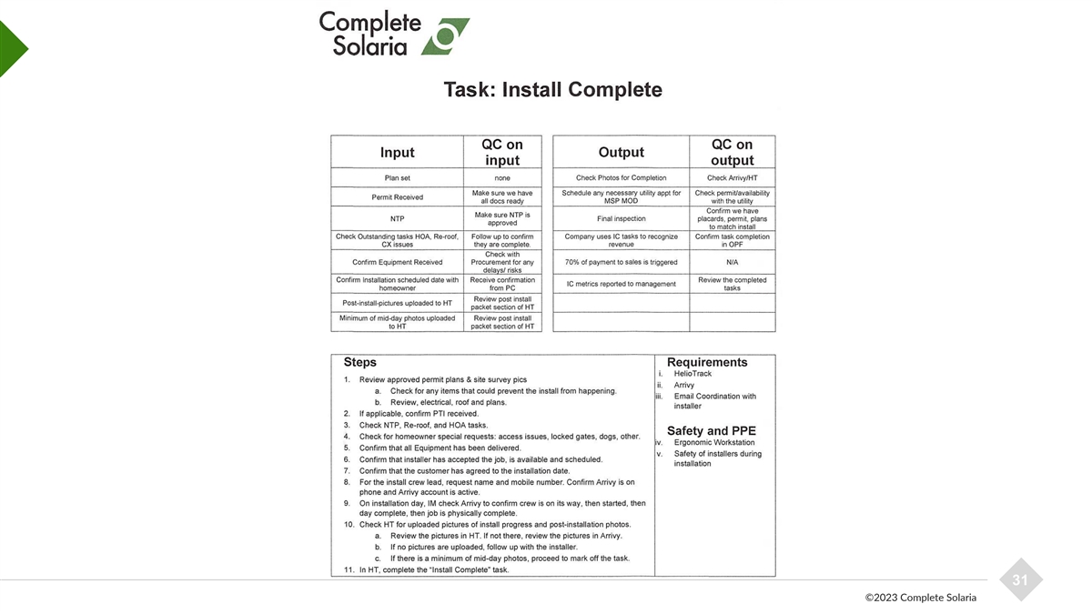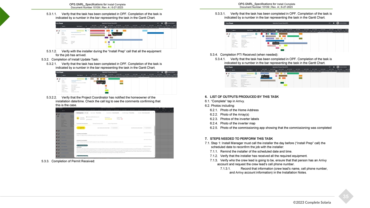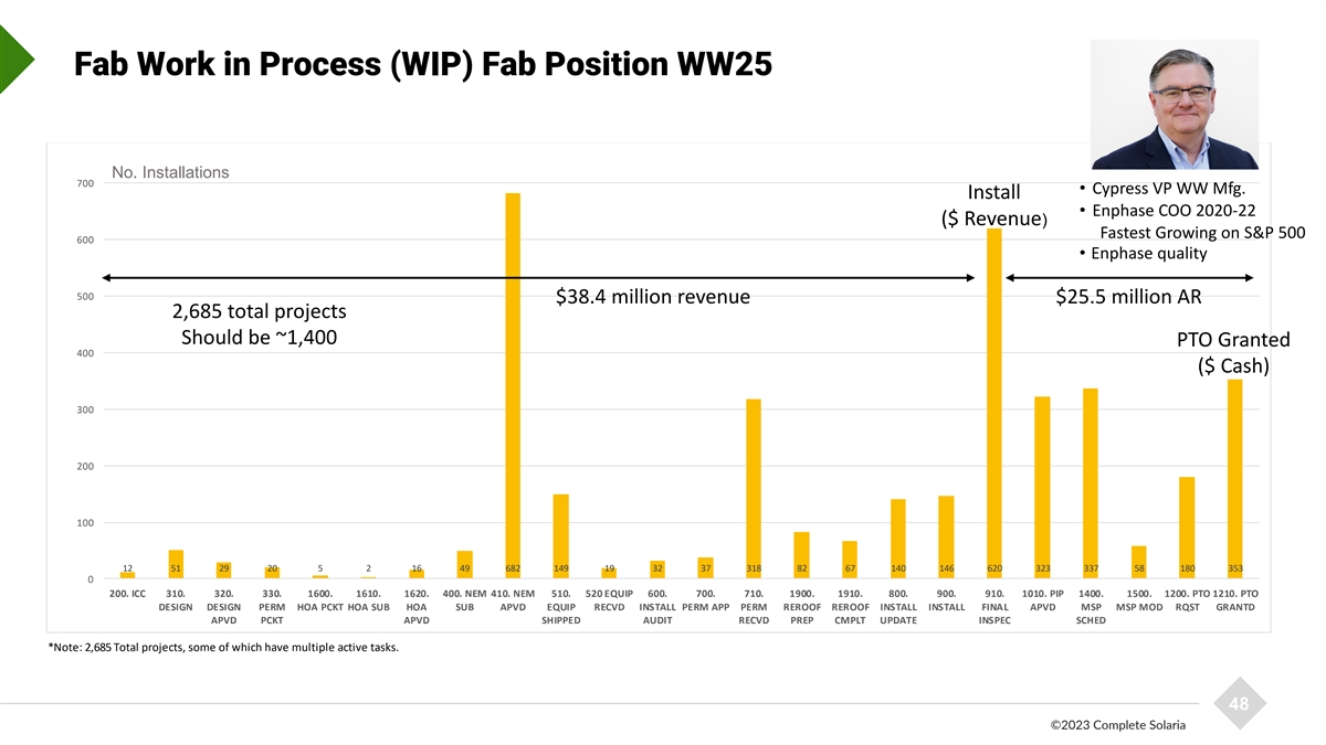 Fab Work in Process (WIP) Fab Position WW25 Active Tasks* No. Installations 700 • Cypress VP WW Mfg. Install • Enphase COO 2020-22 ($ Revenue) Fastest Growing on S&P 500 600 • Enphase quality 500 $38.4 million revenue $25.5 million AR 2,685 total projects Should be ~1,400 PTO Granted 400 ($ Cash) 300 200 100 12 51 29 20 5 2 16 49 682 149 19 32 37 318 82 67 140 146 620 323 337 58 180 353 0 200. ICC 310. 320. 330. 1600. 1610. 1620. 400. NEM 410. NEM 510. 520 EQUIP 600. 700. 710. 1900. 1910. 800. 900. 910. 1010. PIP 1400. 1500. 1200. PTO 1210. PTO DESIGN DESIGN PERM HOA PCKT HOA SUB HOA SUB APVD EQUIP RECVD INSTALL PERM APP PERM REROOF REROOF INSTALL INSTALL FINAL APVD MSP MSP MOD RQST GRANTD APVD PCKT APVD SHIPPED AUDIT RECVD PREP CMPLT UPDATE INSPEC SCHED *Note: 2,685 Total projects, some of which have multiple active tasks. 48 ©2023 Complete Solaria TASKS