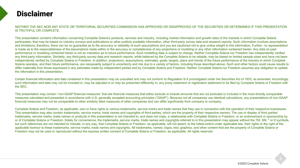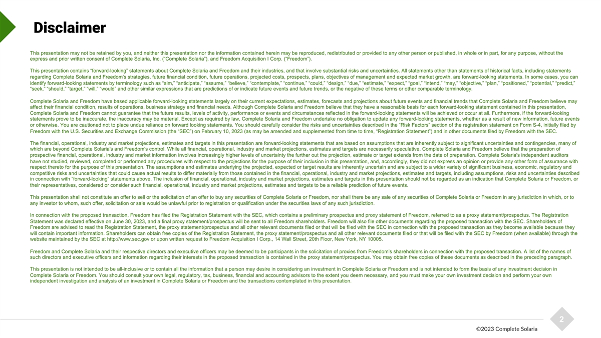 Disclaimer This presentation may not be retained by you, and neither this presentation nor the information contained herein may be reproduced, redistributed or provided to any other person or published, in whole or in part, for any purpose, without the express and prior written consent of Complete Solaria, Inc. (“Complete Solaria”), and Freedom Acquisition I Corp. (“Freedom”). This presentation contains “forward-looking” statements about Complete Solaria and Freedom and their industries, and that involve substantial risks and uncertainties. All statements other than statements of historical facts, including statements regarding Complete Solaria and Freedom’s strategies, future financial condition, future operations, projected costs, prospects, plans, objectives of management and expected market growth, are forward-looking statements. In some cases, you can identify forward-looking statements by terminology such as “aim,” “anticipate,” “assume,” “believe,” “contemplate,” “continue,” “could,” “design,” “due,” “estimate,” “expect,” “goal,” “intend,” “may,” “objective,” “plan,” “positioned,” “potential,” “predict,” “seek,” “should,” “target,” “will,” “would” and other similar expressions that are predictions of or indicate future events and future trends, or the negative of these terms or other comparable terminology. Complete Solaria and Freedom have based applicable forward-looking statements largely on their current expectations, estimates, forecasts and projections about future events and financial trends that Complete Solaria and Freedom believe may affect their financial condition, results of operations, business strategy and financial needs. Although Complete Solaria and Freedom believe that they have a reasonable basis for each forward-looking statement contained in this presentation, Complete Solaria and Freedom cannot guarantee that the future results, levels of activity, performance or events and circumstances reflected in the forward-looking statements will be achieved or occur at all. Furthermore, if the forward-looking statements prove to be inaccurate, the inaccuracy may be material. Except as required by law, Complete Solaria and Freedom undertake no obligation to update any forward-looking statements, whether as a result of new information, future events or otherwise. You are cautioned not to place undue reliance on forward looking statements. You should carefully consider the risks and uncertainties described in the “Risk Factors” section of the registration statement on Form S-4, initially filed by Freedom with the U.S. Securities and Exchange Commission (the “SEC”) on February 10, 2023 (as may be amended and supplemented from time to time, “Registration Statement”) and in other documents filed by Freedom with the SEC. The financial, operational, industry and market projections, estimates and targets in this presentation are forward-looking statements that are based on assumptions that are inherently subject to significant uncertainties and contingencies, many of which are beyond Complete Solaria's and Freedom's control. While all financial, operational, industry and market projections, estimates and targets are necessarily speculative, Complete Solaria and Freedom believe that the preparation of prospective financial, operational, industry and market information involves increasingly higher levels of uncertainty the further out the projection, estimate or target extends from the date of preparation. Complete Solaria's independent auditors have not studied, reviewed, completed or performed any procedures with respect to the projections for the purpose of their inclusion in this presentation, and, accordingly, they did not express an opinion or provide any other form of assurance with respect thereto for the purpose of this presentation. The assumptions and estimates underlying the projected, expected or target results are inherently uncertain and are subject to a wider variety of significant business, economic, regulatory and competitive risks and uncertainties that could cause actual results to differ materially from those contained in the financial, operational, industry and market projections, estimates and targets, including assumptions, risks and uncertainties described in connection with “forward-looking” statements above. The inclusion of financial, operational, industry and market projections, estimates and targets in this presentation should not be regarded as an indication that Complete Solaria or Freedom, or their representatives, considered or consider such financial, operational, industry and market projections, estimates and targets to be a reliable prediction of future events. This presentation shall not constitute an offer to sell or the solicitation of an offer to buy any securities of Complete Solaria or Freedom, nor shall there be any sale of any securities of Complete Solaria or Freedom in any jurisdiction in which, or to any investor to whom, such offer, solicitation or sale would be unlawful prior to registration or qualification under the securities laws of any such jurisdiction. In connection with the proposed transaction, Freedom has filed the Registration Statement with the SEC, which contains a preliminary prospectus and proxy statement of Freedom, referred to as a proxy statement/prospectus. The Registration Statement was declared effective on June 30, 2023, and a final proxy statement/prospectus will be sent to all Freedom shareholders. Freedom will also file other documents regarding the proposed transaction with the SEC. Shareholders of Freedom are advised to read the Registration Statement, the proxy statement/prospectus and all other relevant documents filed or that will be filed with the SEC in connection with the proposed transaction as they become available because they will contain important information. Sharehol