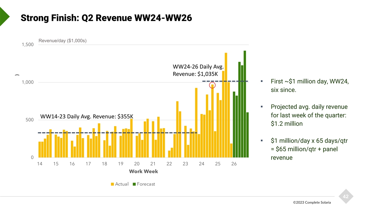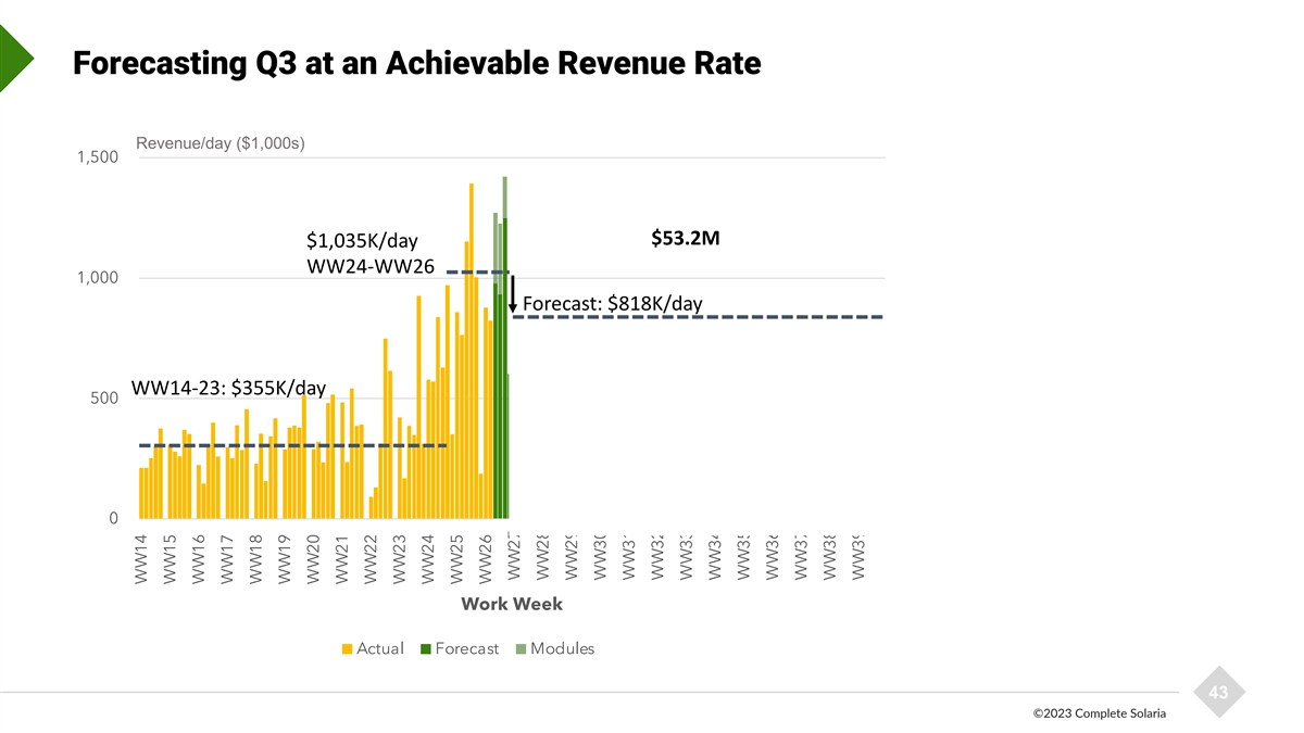 Strong Finish: Q2 Revenue WW24-WW26 Q2 Daily Revenue Revenue/day ($1,000s) 1,500 WW24-26 Daily Avg. Revenue: $1,035K 1,000 ▪ First ~$1 million day, WW24, six since. ▪ Projected avg. daily revenue for last week of the quarter: WW14-23 Daily Avg. Revenue: $355K 500 $1.2 million ▪ $1 million/day x 65 days/qtr = $65 million/qtr + panel 0 revenue 14 15 16 17 18 19 20 21 22 23 24 25 26 Work Week Actual Forecast 42 ©2023 Complete Solaria Daily Revenue ($000)