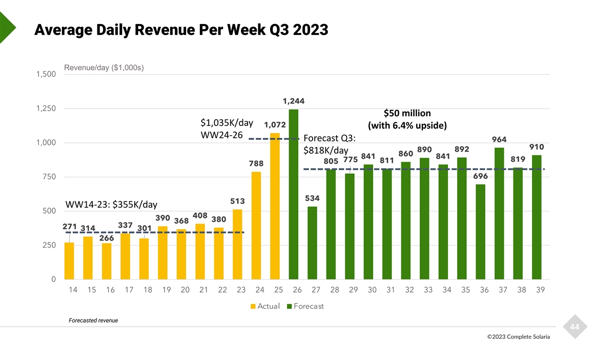 Average Daily Revenue Per Week Q3 2023 Average Daily Revenue / Week Q3 2023 Revenue/day ($1,000s) 1,500 1,244 1,250 $50 million $1,035K/day 1,072 (with 6.4% upside) WW24-26 Forecast Q3: 964 1,000 910 892 890 $818K/day 860 841 841 775 819 811 805 788 696 750 534 513 WW14-23: $355K/day 500 408 390 380 368 337 271 314 301 266 250 0 14 15 16 17 18 19 20 21 22 23 24 25 26 27 28 29 30 31 32 33 34 35 36 37 38 39 Actual Forecast Forecasted revenue 44 ©2023 Complete Solaria ($000)