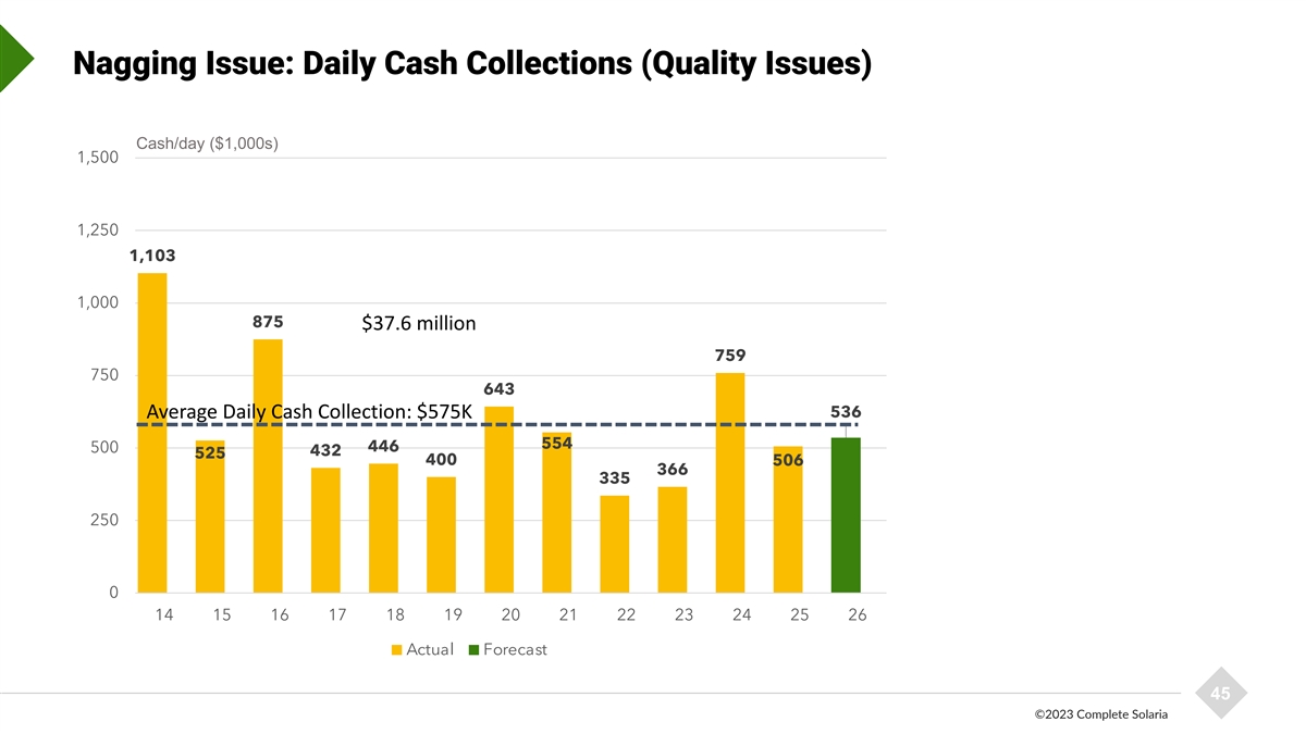 Nagging Issue: Daily Cash Collections (Quality Issues) Average Daily Collections / Week Q2 2023 Cash/day ($1,000s) 1,500 1,250 1,103 1,000 875 $37.6 million 759 750 643 536 Average Daily Cash Collection: $575K 554 446 500 432 525 400 506 366 335 250 0 14 15 16 17 18 19 20 21 22 23 24 25 26 Actual Forecast 45 ©2023 Complete Solaria ($000)