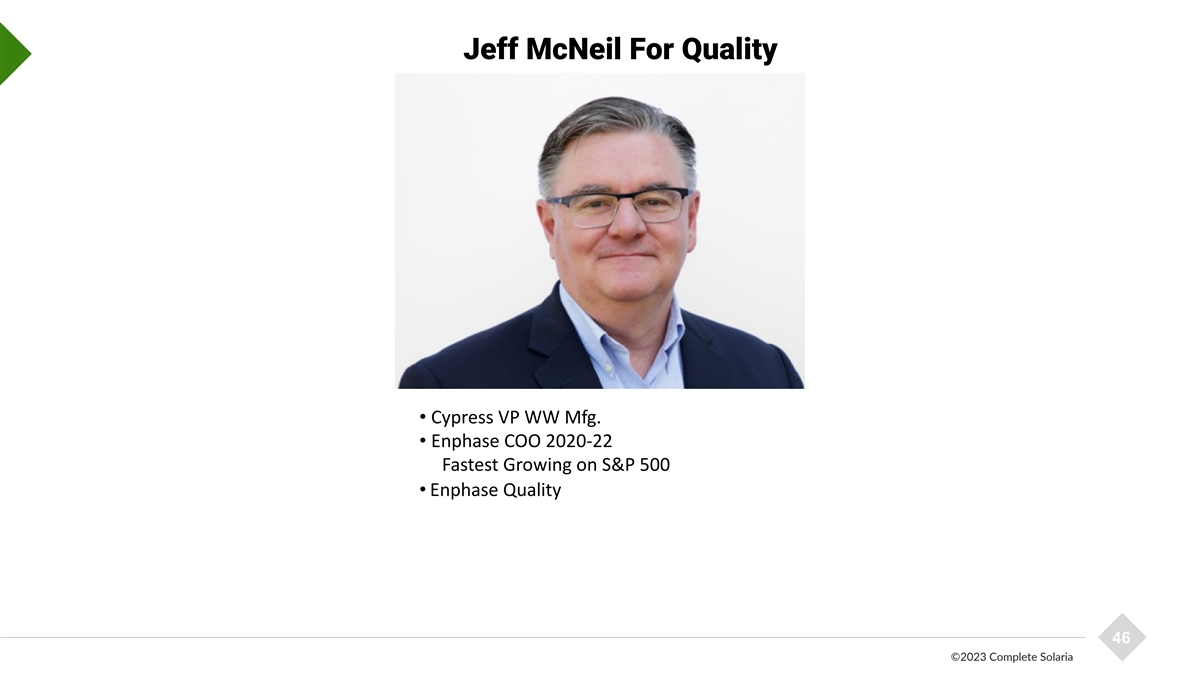 Jeff McNeil For Quality • Cypress VP WW Mfg. • Enphase COO 2020-22 Fastest Growing on S&P 500 • Enphase Quality 46 ©2023 Complete Solaria