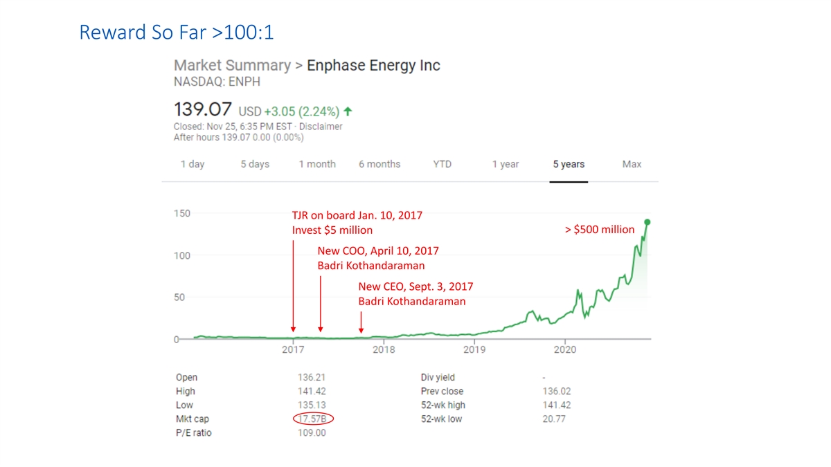 Reward So Far >100:1 TJR on board Jan. 10, 2017 Invest $5 million > $500 million New COO, April 10, 2017 Badri Kothandaraman New CEO, Sept. 3, 2017 Badri Kothandaraman