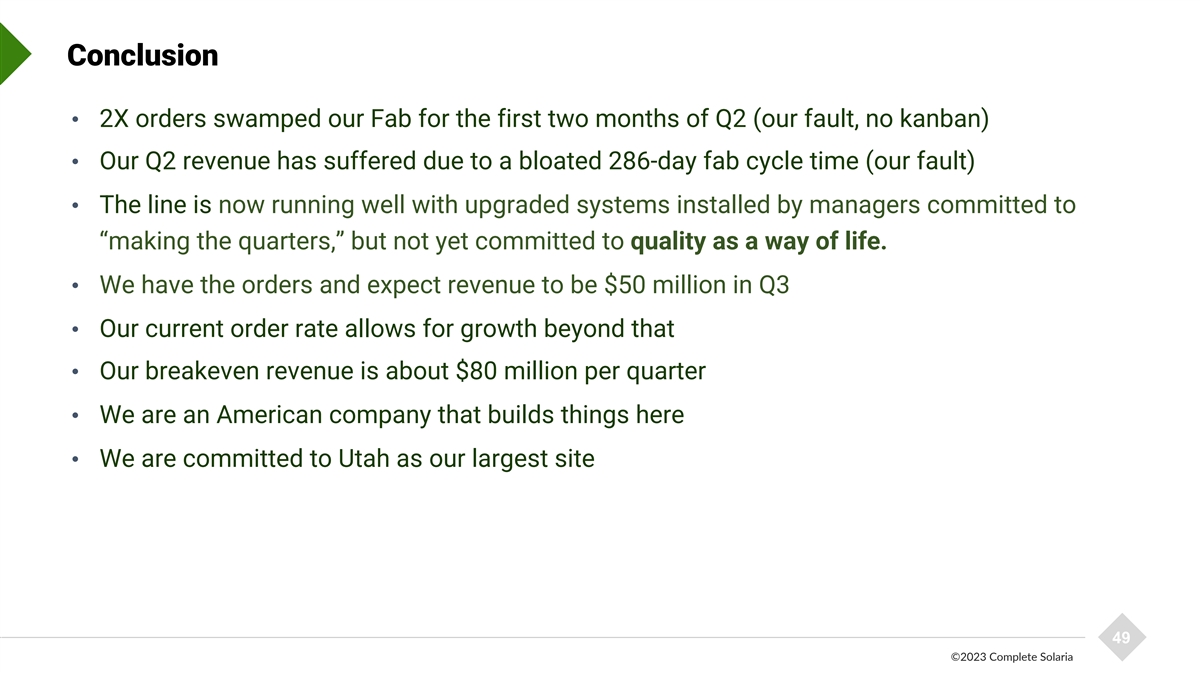 Conclusion • 2X orders swamped our Fab for the first two months of Q2 (our fault, no kanban) • Our Q2 revenue has suffered due to a bloated 286-day fab cycle time (our fault) • The line is now running well with upgraded systems installed by managers committed to “making the quarters,” but not yet committed to quality as a way of life. • We have the orders and expect revenue to be $50 million in Q3 • Our current order rate allows for growth beyond that • Our breakeven revenue is about $80 million per quarter • We are an American company that builds things here • We are committed to Utah as our largest site 49 ©2023 Complete Solaria
