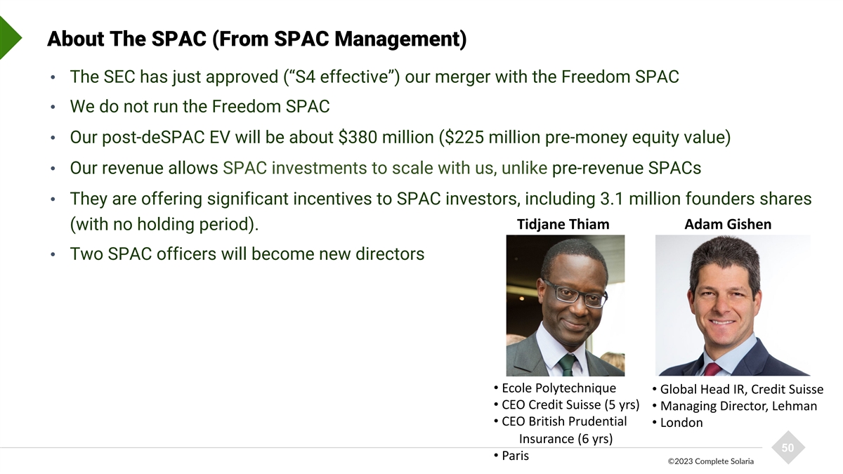 About The SPAC (From SPAC Management) • The SEC has just approved (“S4 effective”) our merger with the Freedom SPAC • We do not run the Freedom SPAC • Our post-deSPAC EV will be about $380 million ($225 million pre-money equity value) • Our revenue allows SPAC investments to scale with us, unlike pre-revenue SPACs • They are offering significant incentives to SPAC investors, including 3.1 million founders shares Tidjane Thiam Adam Gishen (with no holding period). • Two SPAC officers will become new directors • Ecole Polytechnique • Global Head IR, Credit Suisse • CEO Credit Suisse (5 yrs) • Managing Director, Lehman • CEO British Prudential • London Insurance (6 yrs) 50 • Paris ©2023 Complete Solaria