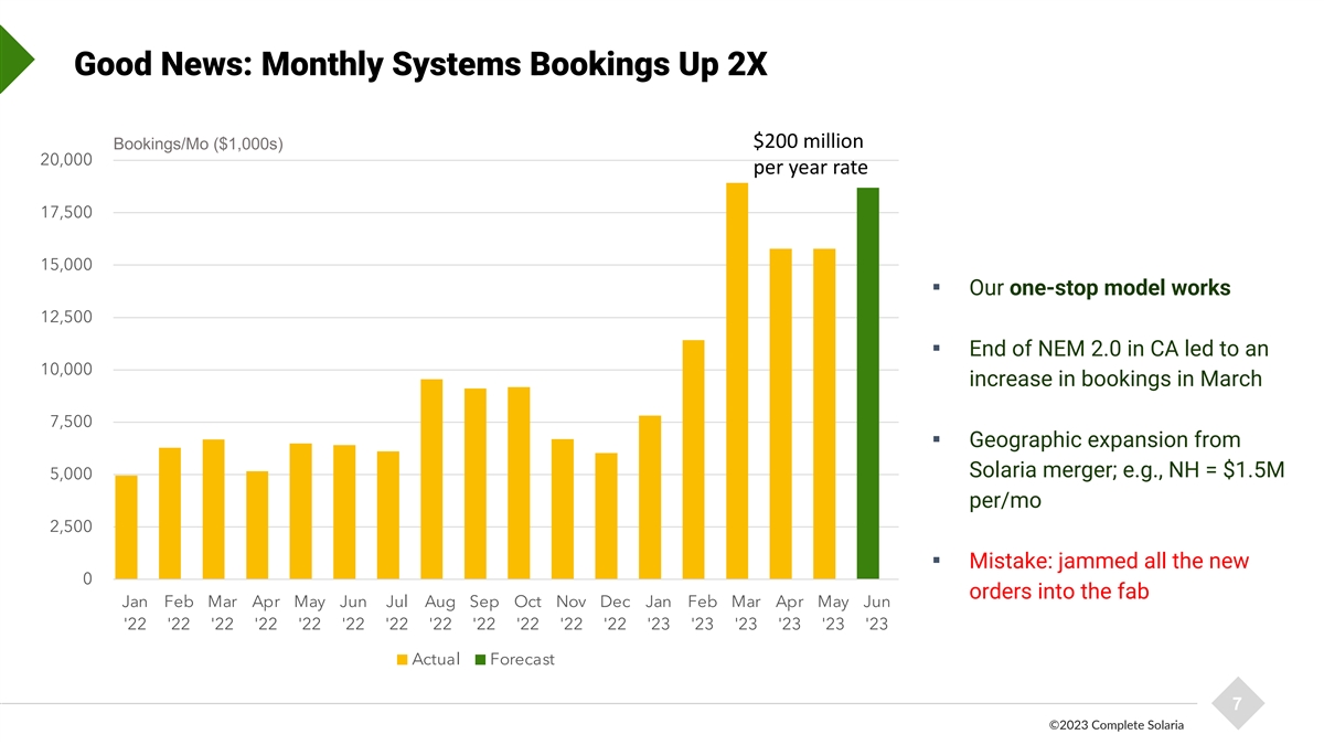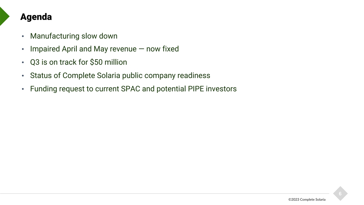 Agenda • Manufacturing slow down • Impaired April and May revenue — now fixed • Q3 is on track for $50 million • Status of Complete Solaria public company readiness • Funding request to current SPAC and potential PIPE investors 6 ©2023 Complete Solaria