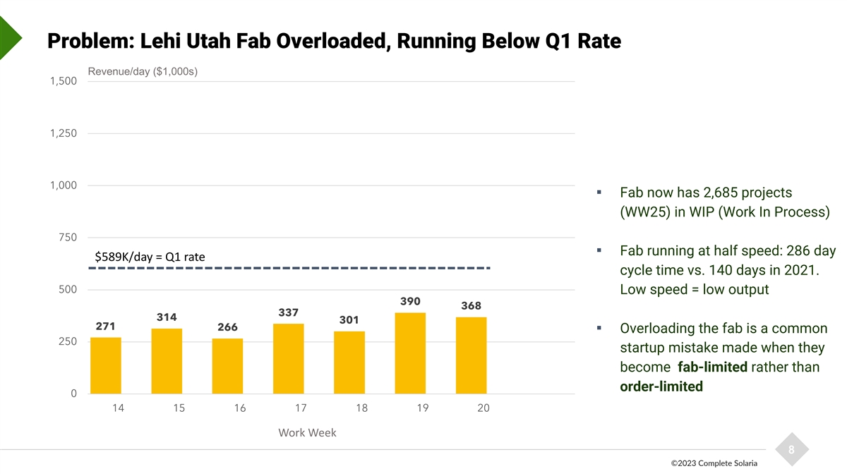 Problem: Lehi Utah Fab Overloaded, Running Below Q1 Rate Revenue/day ($1,000s) 1,500 1,250 1,000 ▪ Fab now has 2,685 projects (WW25) in WIP (Work In Process) 750 ▪ Fab running at half speed: 286 day $589K/day = Q1 rate cycle time vs. 140 days in 2021. 500 Low speed = low output 390 368 337 314 301 271 266 ▪ Overloading the fab is a common 250 startup mistake made when they become fab-limited rather than order-limited 0 14 15 16 17 18 19 20 Actual Work Week 8 ©2023 Complete Solaria ($000)