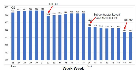 As shown in the headcount graph below, by the end of the second quarter (WW26), our headcount had been reduced to 415. In Q3 (WW39), two more RIFs reduced our headcount further to 321 in Q3, saving an incremental $10.6 million annually. Today (WW46), our headcount is down 33% to 285 and will be lower yet by the end of the quarter. And – as is typical – when the lean method is used, our performance has actually improved with fewer people.