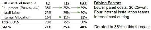 We improved gross margin from 18% in Q2 to 25% in Q3. The primary contributors to the improvement in Q3 were reductions in the cost of solar modules and other equipment and reduced headcount. These gains were partially offset by an increase in installation labor, especially in the Northeastern US. We invested in four internal installation teams which will provide lower Q4 installation costs. Our “GM47” project, which I personally run, is targeted to add ten percentage points to our Q3 GM of 25% this quarter, as quantified below: