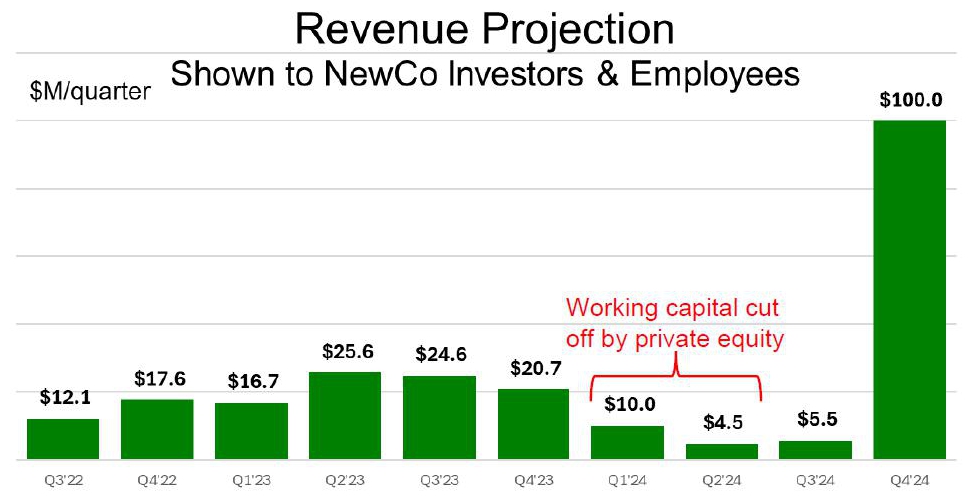 The first five-quarter plan (Q4’24-Q4’25) presented to investors in the $80 million funding presentation called for $100 million in revenue in Q4’24 for the combined company with a sustainable operating income loss of $1.0 million, followed in Q2’25 by its first profitable quarter ($0.4 million).