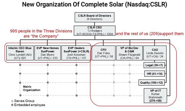 Complete Solar CEO, T.J. Rodgers said, “On Wednesday, November 6, 2024 at our Orem, Utah HQ, we presented to over 1,000 employees the details of our Rev. 5 Annual Operating Plan for cutting headcount and other costs to achieve breakeven operating income in 2025.