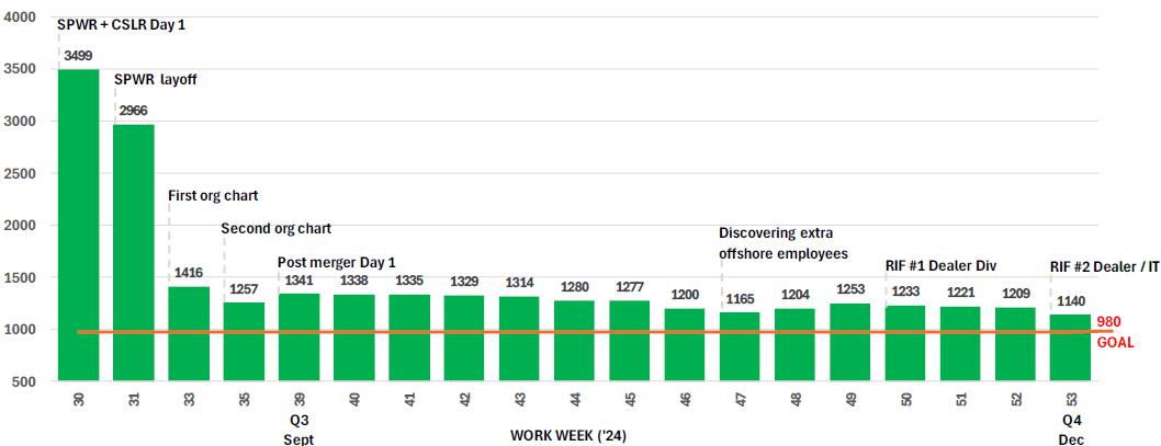 The Company is almost at itsfighting weight.” The combined headcount of the two companies started at 3,499 on October 1 and was reduced by 67% to 1,140 by the end of Q4’24, as shown in the embedded org chart. Our final headcount target for the combined company is 980.