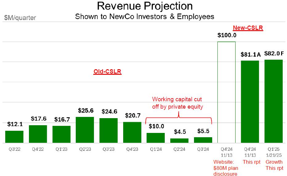 In our November 13 Third Quarter Report, we presented an operating plan for Complete Solar predicated on our successful $45 million acquisition of business unit assets from SunPower to form a Complete Solar “NewCo” (herein called CSLR). This plan called for two big accomplishments that have now been achieved: 1) that the old-CSLR, a small solar company with little cash and only $5.5 million of prior-quarter revenue, would acquire and integrate assets of the SunPower corporation, which was founded in 1985 and about 10 times bigger than old-CSLR, and 2) that, as we wrote in our Third Quarter Report, “our revenue would be $80 million in Q4’24,” the quarter after the asset purchase. This report presents Q4’24 combined company results on a GAAP-compliant basis and certain non-GAAP results and our Q1’25 forecast. The narrative is based on the non-GAAP financial results, unless otherwise noted: