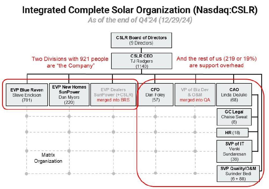 When we were raising the $80 million in Q4’24 for the merger, the first five-quarter plan presented to investors called for $100 million in revenue in Q4’24, and an operating loss of $1.0 million, followed by breakeven operating income in Q2’25. After the backlog uncertainty caused by order cancellations due to the SPWR bankruptcy, we revised our post-integration Q4’24 revenue estimate to $80 million from $100 million in our November 13 Third Quarter Report – and also gave an improved breakeven revenue forecast of $80 million to our shareholders, which, in turn, reduced the allowable number of employees CSLR would support from 1,225 to 980.