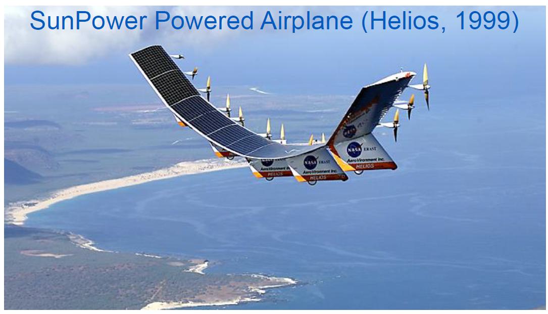 The NASA Helios airplane had 14 electric motors that used SunPower all-black high-efficiency cells to take off and land on its own power. In 2001, it set an all-time altitude record of 96,863 feet, which still stands. The F-15 Eagle, a mach 2.5 fighter, capable of accelerating while climbing vertically, has a service ceiling of 72,000 feet.