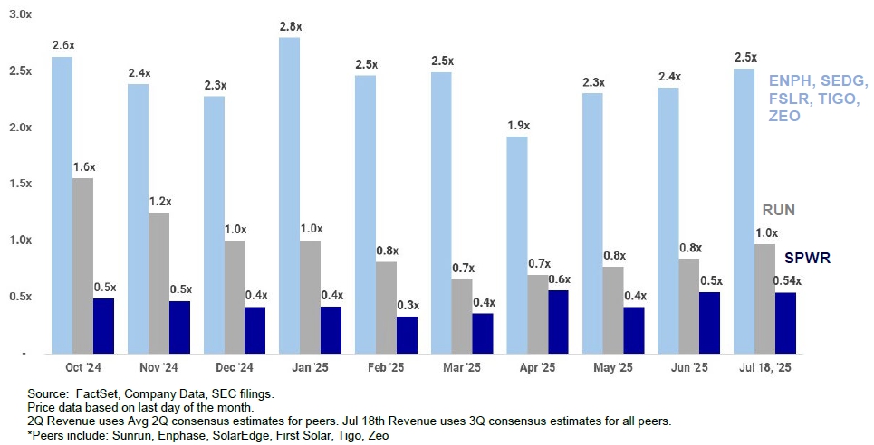 Our basket of comparison tech stocks* has a stable P/S ratio of 2.5x (my old company, Cypress Semiconductor, had a 30-year median P/S ratio of 2.4x), but the solar industry has recently been under tariff and ITC pressure, which even caused the solar leader, SunRun, to bottom out at 0.7x, with a current recovery to 1.0x. So, why is SPWR dragging along at 0.54x despite good financial performance?