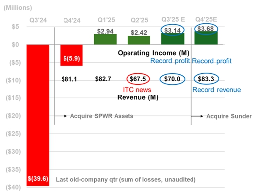 The Sunder acquisition is expected to add approximately $74 million ($18.5 million/qtr) to SunPower’s sales revenue starting in Q4’25 and, in addition, $86.5 million ($21.6 million/qtr) in EPC sales, ramping up over the next 12 months (see the operating profit graph on page 3). The cost of the acquisition is $40 million in cash plus 10 million shares of common stock, subject to SunPower stockholder approval. The funding to close the deal was raised in a private offering of convertible debentures managed by Cantor Fitzgerald, acting as placement agent, and funded largely by the investors who supported the SunPower asset purchases.