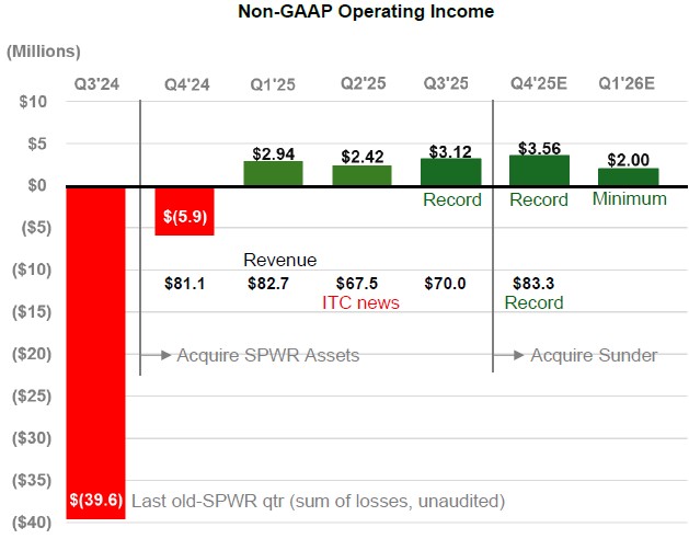 SunPower CEO, T.J. Rodgers commented, “In the Q2’25 Shareholder Report, I used an analogy to the legendary 1967 Ice Bowl in Green Bay (minus 18oF) to describe our 18% Q2’25 revenue freeze to $67.5 million. We have now bounced back in Q3’25 to $70.0 million in revenue with record $3.12 million operating income. In Q4’25, we expect further revenue growth to $83.3 million with $3.56 million in operating income, both would be records.”