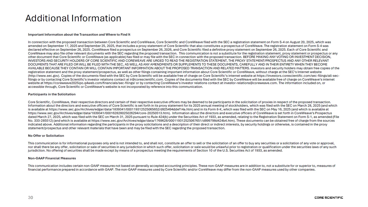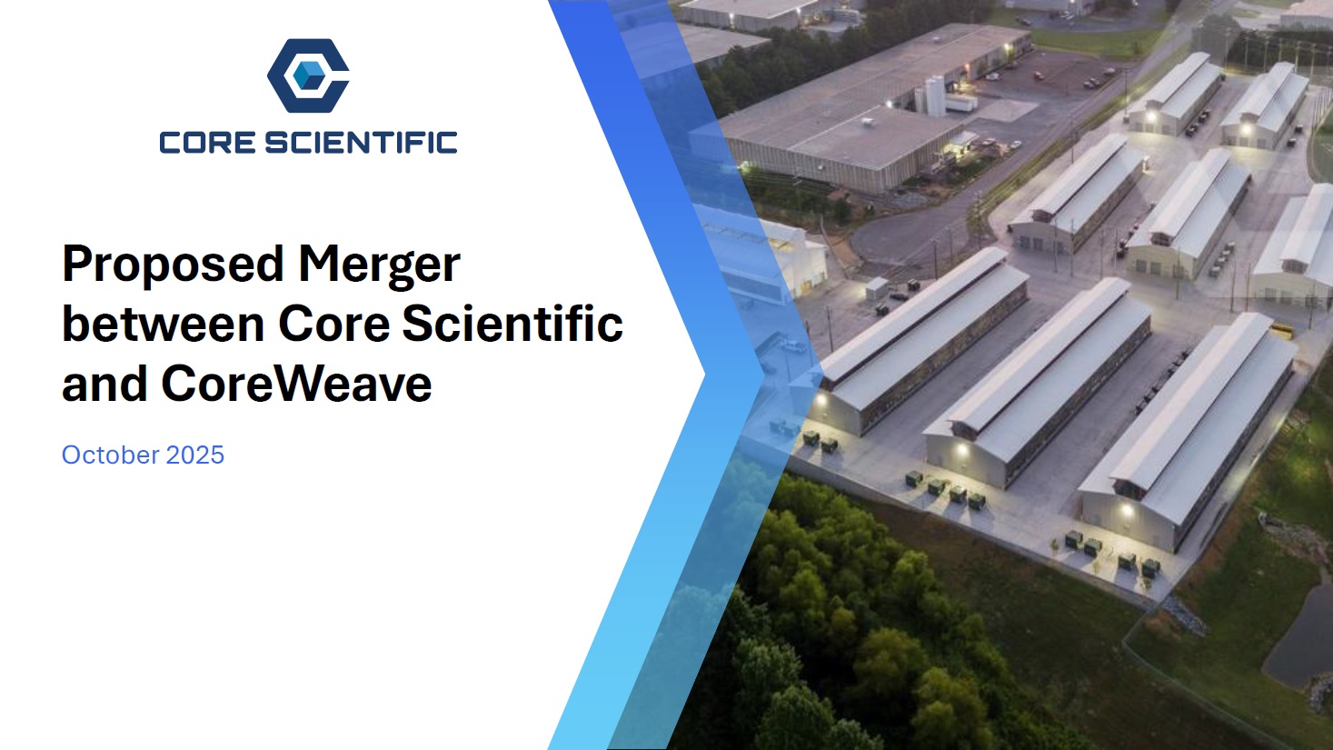 Important Information about the Transaction and Where to Find It  In connection with the proposed transaction between Core Scientific and CoreWeave, Core Scientific and CoreWeave filed with the SEC a registration statement on Form S-4 on August 20, 2025, which was amended on September 17, 2025 and September 25, 2025, that includes a proxy statement of Core Scientific that also constitutes a prospectus of CoreWeave. The registration statement on Form S-4 was declared effective on September 26, 2025. CoreWeave filed a prospectus on September 26, 2026, and Core Scientific filed a definitive proxy statement on September 26, 2025. Each of Core Scientific and CoreWeave may also file other relevant documents with the SEC regarding the proposed transaction. This communication is not a substitute for the registration statement, proxy statement or prospectus or any other document that Core Scientific or CoreWeave (as applicable) has filed or may file with the SEC in connection with the proposed transaction. BEFORE MAKING ANY VOTING OR INVESTMENT DECISION, INVESTORS AND SECURITY HOLDERS OF CORE SCIENTIFIC AND COREWEAVE ARE URGED TO READ THE REGISTRATION STATEMENT, THE PROXY STATEMENT/PROSPECTUS AND ANY OTHER RELEVANT DOCUMENTS THAT ARE FILED OR WILL BE FILED WITH THE SEC, AS WELL AS ANY AMENDMENTS OR SUPPLEMENTS TO THESE DOCUMENTS, CAREFULLY AND IN THEIR ENTIRETY WHEN THEY BECOME  AVAILABLE BECAUSE THEY CONTAIN OR WILL CONTAIN IMPORTANT INFORMATION ABOUT THE PROPOSED TRANSACTION AND RELATED MATTERS. Investors and security holders may obtain free copies of the registration statement and the proxy statement/prospectus, as well as other filings containing important information about Core Scientific or CoreWeave, without charge at the SEC’s Internet website (http://www.sec.gov). Copies of the documents filed with the SEC by Core Scientific will be available free of charge on Core Scientific’s internet website at https://investors.corescientific.com/sec-filings/all-sec- filings or by contacting Core Scientific’s investor relations contact at ir@corescientific.com. Copies of the documents filed with the SEC by CoreWeave will be available free of charge on CoreWeave’s internet website at https://coreweave2025ipo.q4web.com/financials/sec-filings/ or by contacting CoreWeave’s investor relations contact at investor-relations@coreweave.com. The information included on, or  accessible through, Core Scientific or CoreWeave’s website is not incorporated by reference into this communication.  Participants in the Solicitation  Core Scientific, CoreWeave, their respective directors and certain of their respective executive officers may be deemed to be participants in the solicitation of proxies in respect of the proposed transaction. Information about the directors and executive officers of Core Scientific is set forth in its proxy statement for its 2025 annual meeting of stockholders, which was filed with the SEC on March 28, 2025 (and which is available at https://www.sec.gov/Archives/edgar/data/1839341/000119312525065652/d925494ddef14a.htm) and in its Form 8-K, which was filed with the SEC on May 16, 2025 (and which is available at https://www.sec.gov/Archives/edgar/data/1839341/000162828025026294/core-20250513.htm). Information about the directors and executive officers of CoreWeave is set forth in CoreWeave’s Prospectus dated March 27, 2025, which was filed with the SEC on March 31, 2025 pursuant to Rule 424(b) under the Securities Act of 1933, as amended, relating to the Registration Statement on Form S-1, as amended (File No. 333-285512) (and which is available at https://www.sec.gov/Archives/edgar/data/1769628/000119312525067651/d899798d424b4.htm). These documents can be obtained free of charge from the sources indicated above. Additional information regarding the participants in the proxy solicitations and a description of their direct or indirect interests, by security holdings or otherwise, is contained in the proxy statement/prospectus and other relevant materials that have been and may be filed with the SEC regarding the proposed transaction.  No Offer or Solicitation  This communication is for informational purposes only and is not intended to, and shall not, constitute an offer to sell or the solicitation of an offer to buy any securities or a solicitation of any vote or approval, nor shall there be any offer, solicitation or sale of securities in any jurisdiction in which such offer, solicitation or sale would be unlawful prior to registration or qualification under the securities laws of any such jurisdiction. No offering of securities shall be made except by means of a prospectus meeting the requirements of Section 10 of the U.S. Securities Act of 1933, as amended.  Non-GAAP Financial Measures  This communication includes certain non-GAAP measures not based on generally accepted accounting principles. These non-GAAP measures are in addition to, not a substitute for or superior to, measures of financial performance prepared in accordance with GAAP. The non-GAAP measures used by Core Scientific and/or CoreWeave may differ from the non-GAAP measures used by other companies.  27  Additional Information