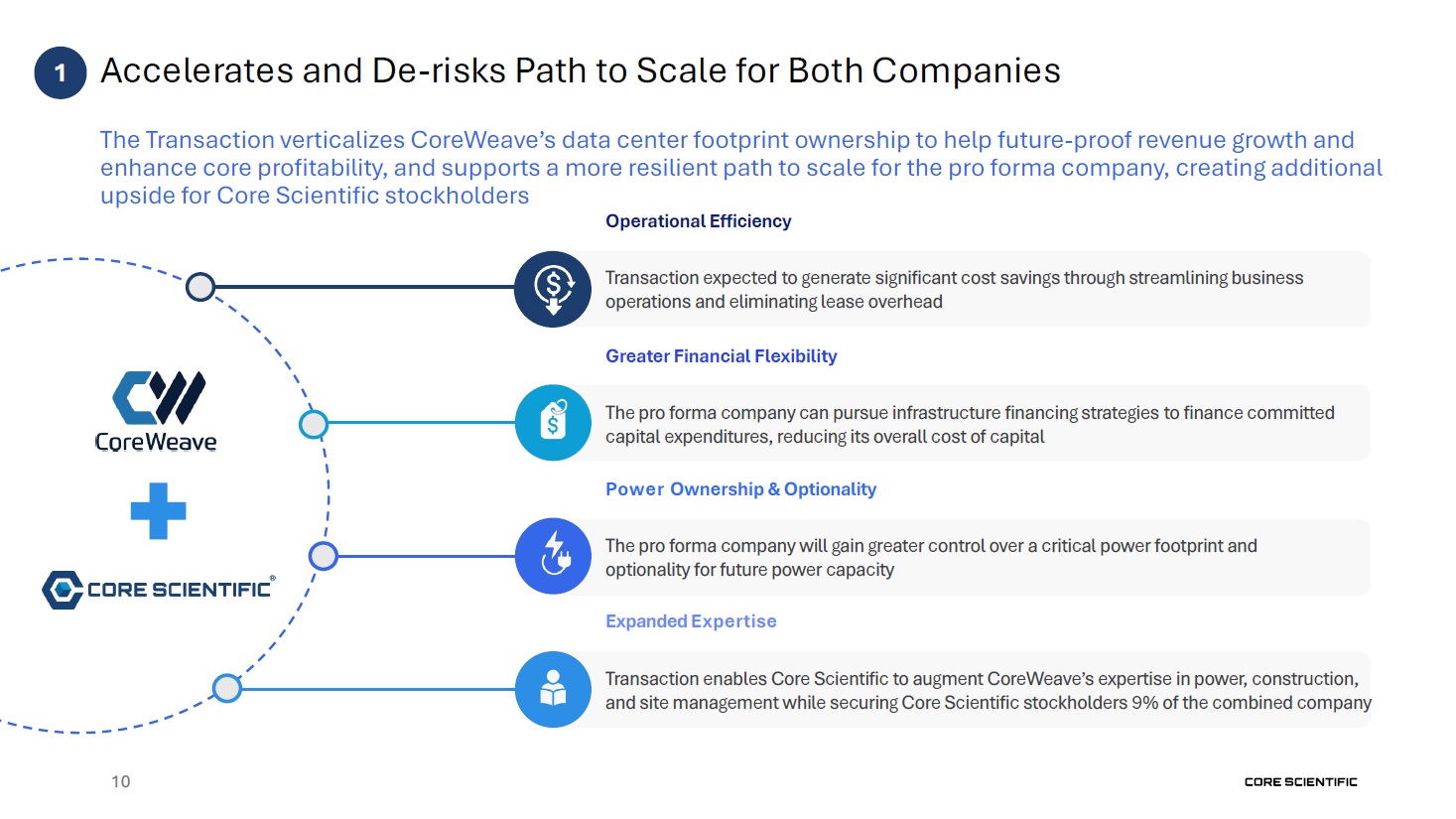 Accelerates and De-risks Path to Scale for Both Companies  The Transaction verticalizes CoreWeave’s data center footprint ownership to help future-proof revenue growth and enhance core profitability, and supports a more resilient path to scale for the pro forma company, creating additional upside for Core Scientific stockholders  Operational Efficiency  Transaction expected to generate significant cost savings through streamlining business operations and eliminating lease overhead  Greater Financial Flexibility  The pro forma company can pursue infrastructure financing strategies to finance committed capital expenditures, reducing its overall cost of capital  Power Ownership & Optionality  The pro forma company will gain greater control over a critical power footprint and  optionality for future power capacity  Expanded Expertise  Transaction enables Core Scientific to augment CoreWeave’s expertise in power, construction,  and site management while securing Core Scientific stockholders 9% of the combined company  1  10